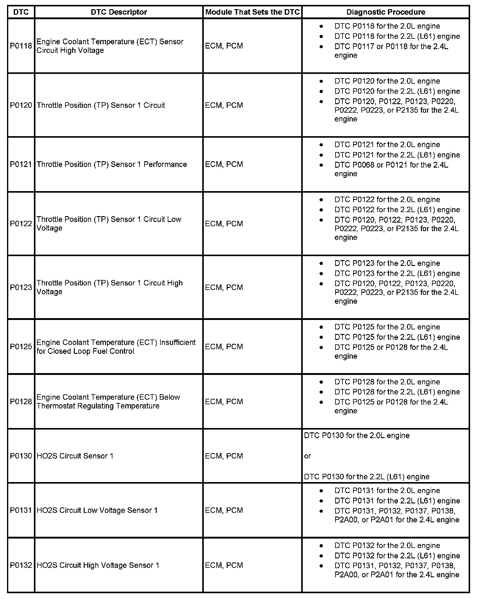 DTCs P0118 - P0132: