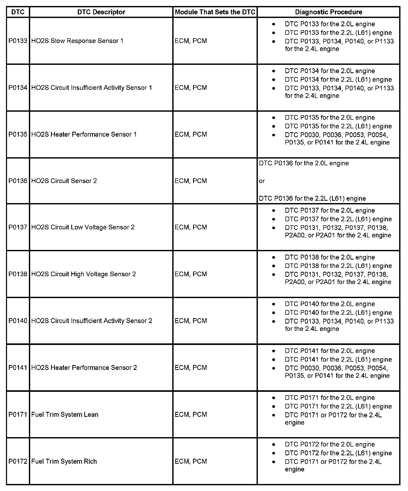 DTCs P0133 - P0172: