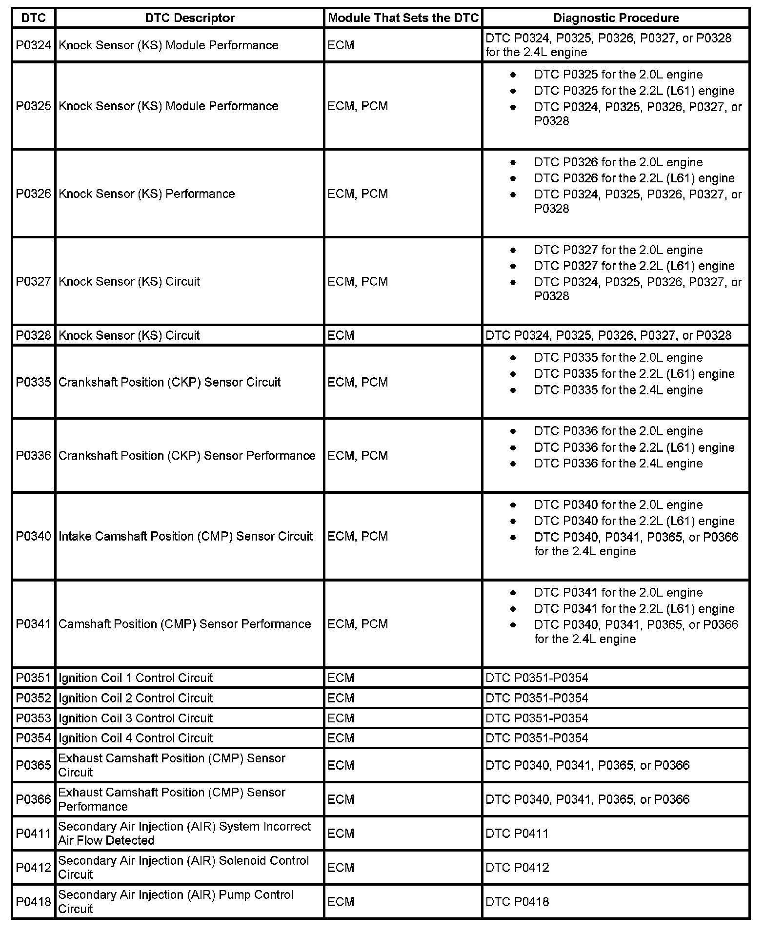 DTCs P0324 - P0418: