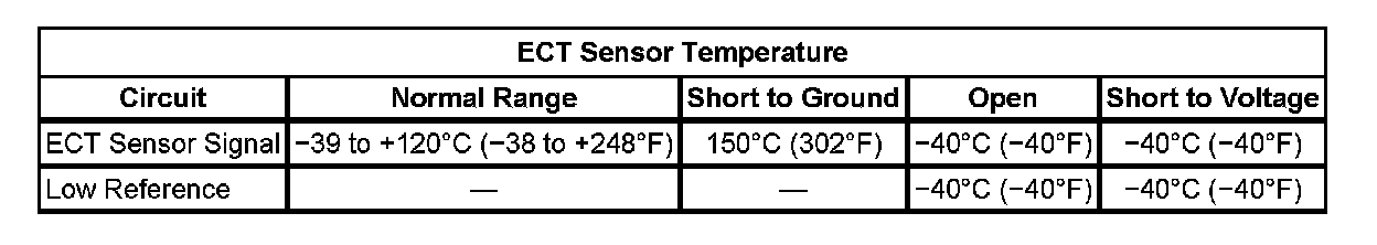 - If the ECT Sensor parameter is more than 149°C (300°F), then test the ECT sensor signal circuit for a short to ground.