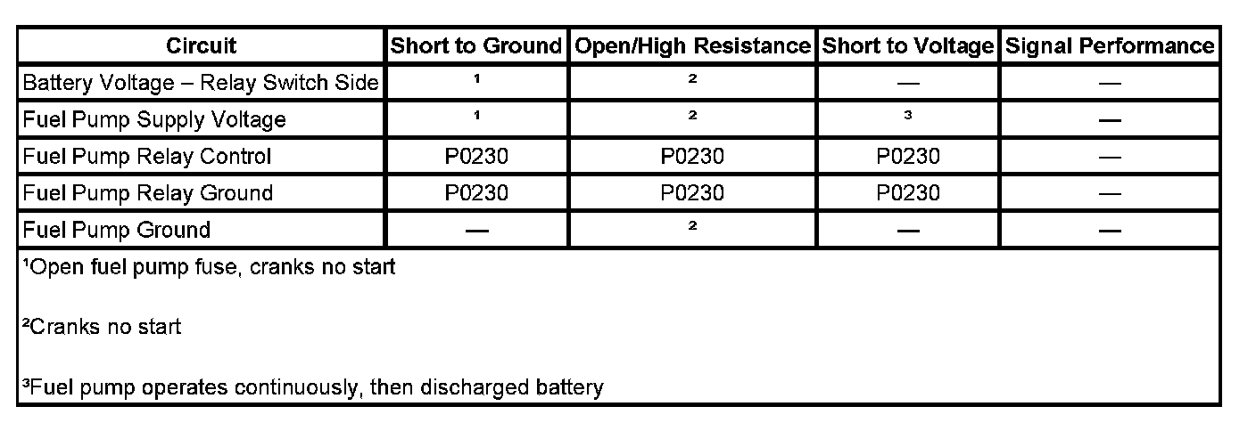 The control module monitors the voltage on the fuel pump relay control circuit. If the control module detects an incorrect voltage on the fuel pump relay control circuit, a fuel pump relay control DTC sets.