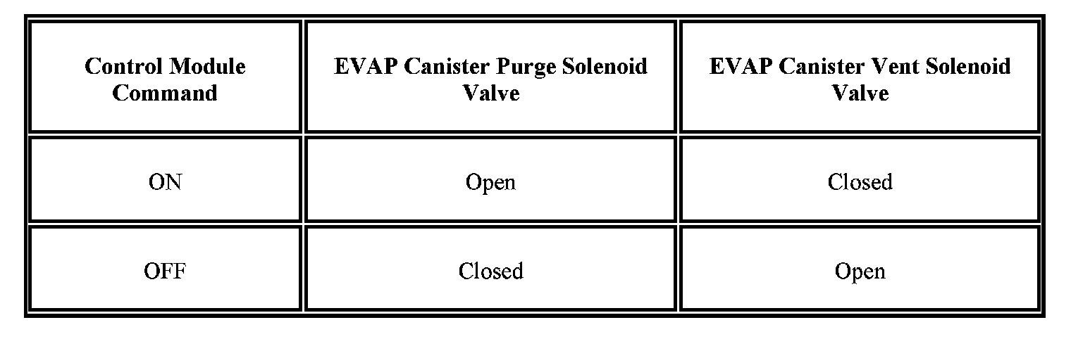 This DTC tests for undesired intake manifold vacuum flow to the evaporative emission (EVAP) system. The control module seals the EVAP system by commanding the EVAP canister purge solenoid valve OFF and the EVAP canister vent solenoid valve ON. The control module monitors the fuel tank pressure (FTP) sensor to determine if a vacuum is being drawn on the EVAP system. If vacuum in the EVAP system is more than a predetermined value within a predetermined time, this DTC sets. The following table illustrates the relationship between the ON and OFF states, and the Open or Closed states of the EVAP canister purge and vent solenoid valves.