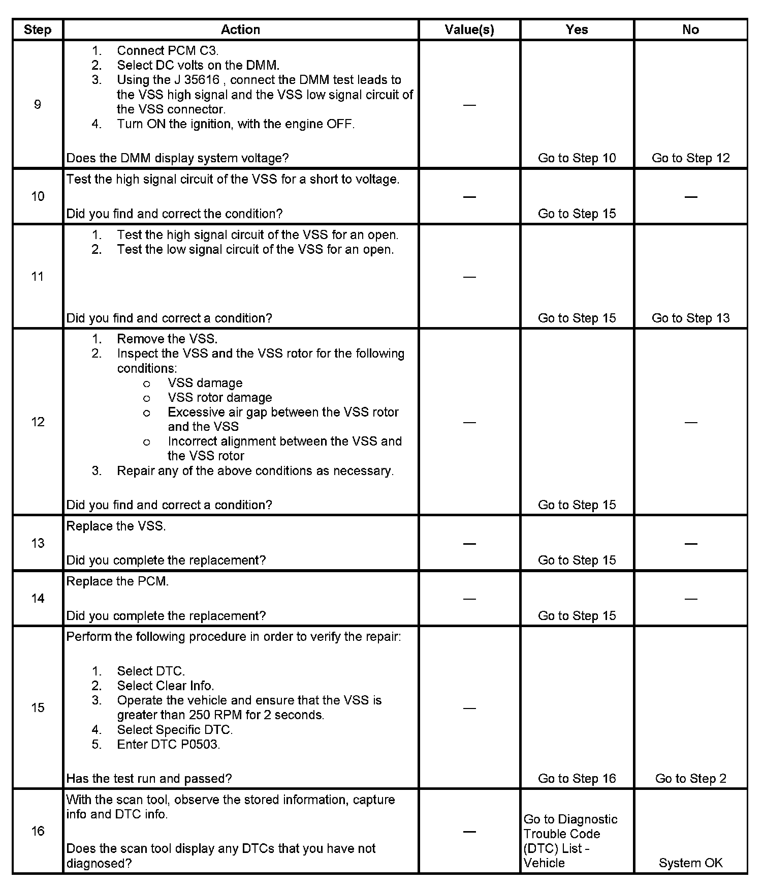 If the PCM detects no vehicle speed for a specified length of time, while other sensors indicate that the vehicle is moving, DTC P0503 sets. DTC P0503 is a type B DTC.