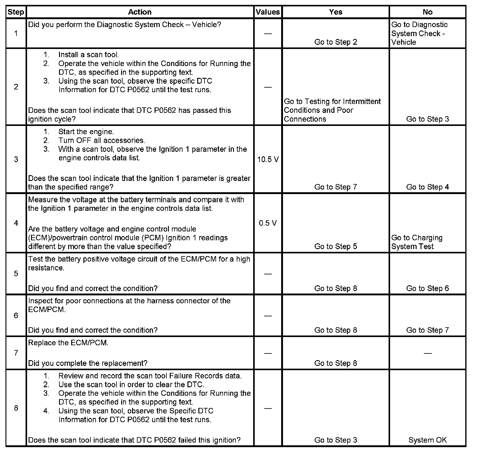 The engine control module (ECM)/powertrain control module (PCM) checks the system voltage to make sure that the voltage stays within the proper range. Damage to components and incorrect input can occur when the voltage is out of range. The ECM/PCM monitors the system voltage over an extended length of time. If the ECM/PCM detects an excessively low system voltage, DTC P0562 will set.