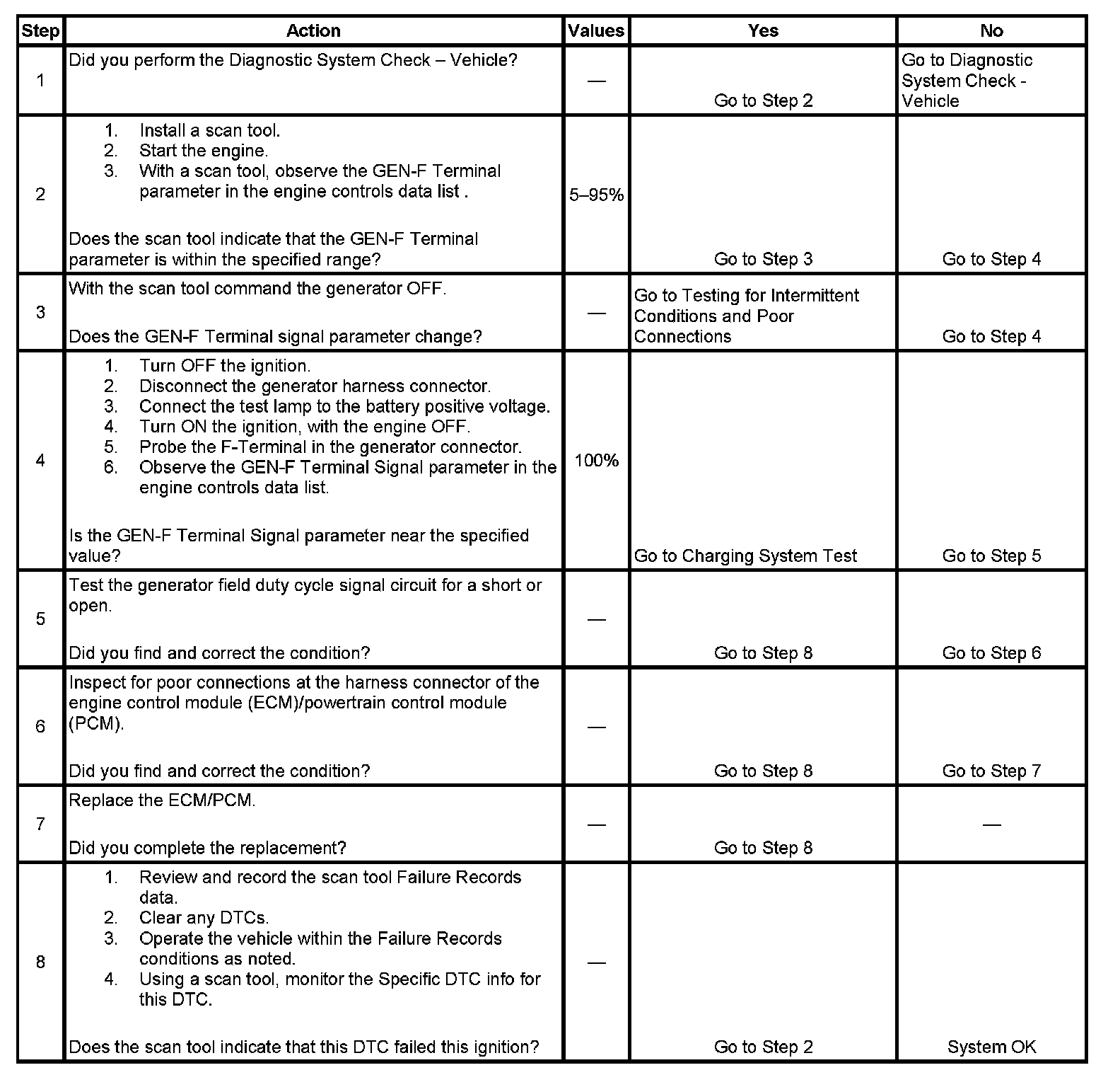 The ECM/PCM monitors the state of the generator field duty cycle signal circuit. When the key is in the RUN position and the engine is OFF, the ECM/PCM should detect a duty cycle near 0 percent. However, when the engine is running, the duty cycle should be between 5-100 percent. The ECM/PCM monitors the PWM signal. If the ECM/PCM detects an out of range PWM signal, DTC P0622 will set. When the DTC sets, the ECM/PCM will send a serial data message to the instrument panel cluster (IPC) to illuminate the charge indicator.