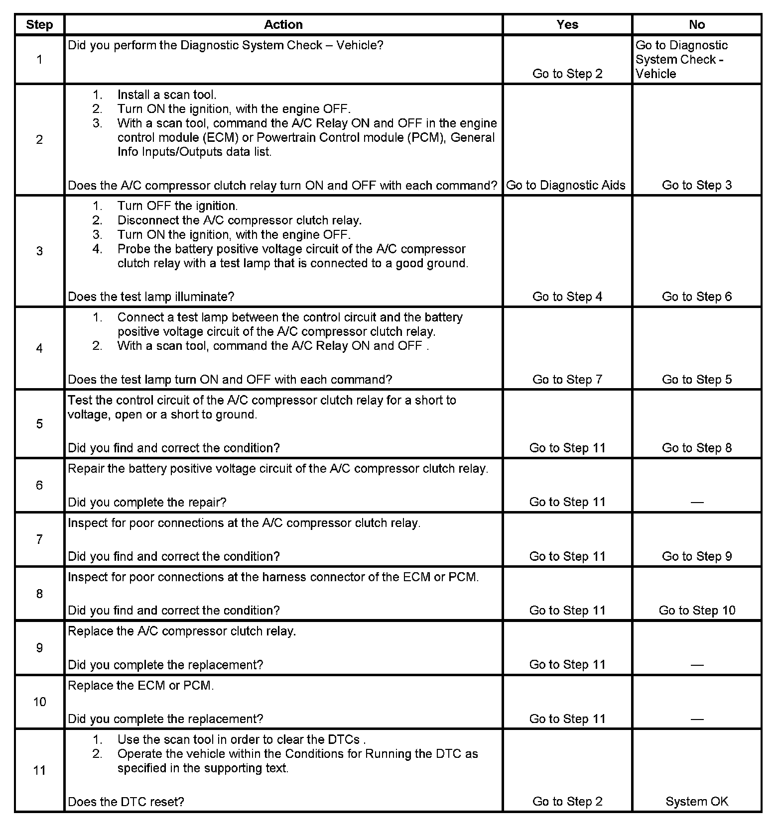 Ignition voltage is supplied directly to the A/C compressor clutch relay. The engine control module (ECM) or powertrain control module (PCM) controls the relay by grounding the A/C compressor clutch relay control circuit via an internal solid state device called a driver. The primary function of the driver is to supply the ground for the component being controlled. The driver has a fault line which is monitored by the ECM or PCM. When the ECM or PCM is commanding a component ON, the voltage of the control circuit should be near 0 volts. When the ECM or PCM is commanding the control circuit to a component OFF, the voltage potential of the circuit should be near battery voltage. If the fault detection circuit senses a voltage other than what is expected, this DTC will set.