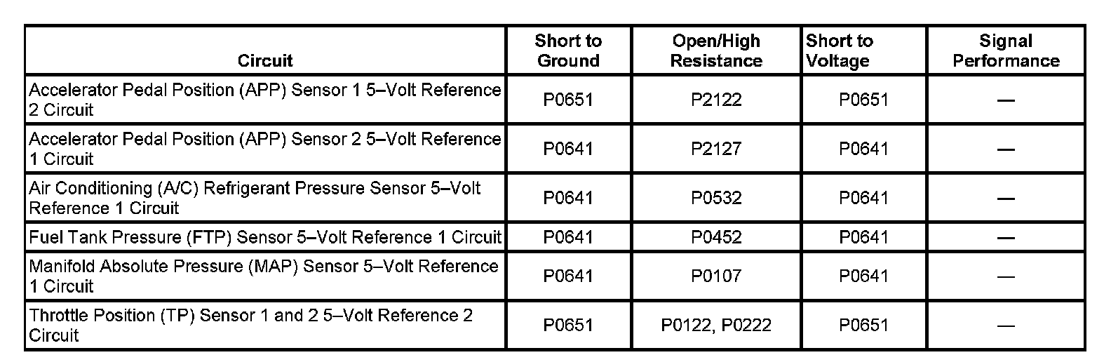The engine control module (ECM) has 2 internal 5-volt reference busses called 5-volt reference 1 and 5-volt reference 2. Each reference bus provides 5-volt reference circuits for more than one sensor. Therefore, a fault condition on one 5-volt reference circuit will affect the other 5-volt reference circuits connected to that reference bus. The ECM monitors the voltage on the 5-volt reference busses.