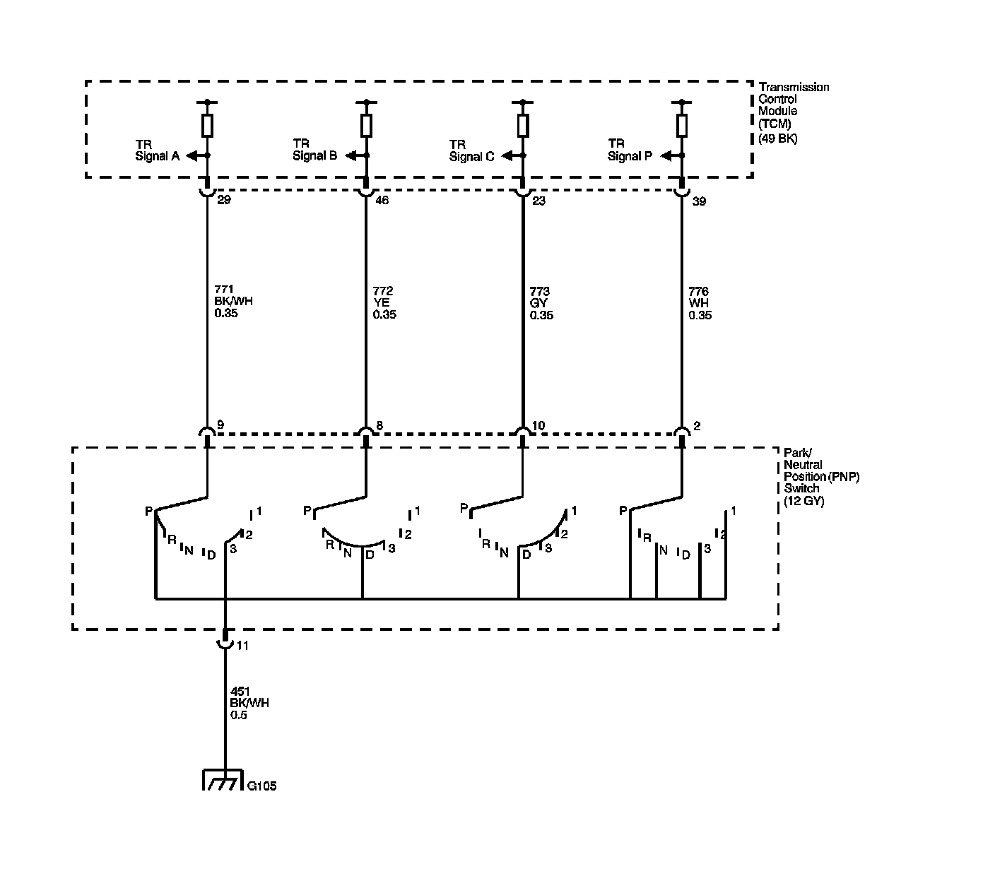 The transmission range (TR) switch is part of the park/neutral position switch and is mounted on the transmission manual shaft. The TR switch is a multi-signal switch. The transmission control module (TCM) supplies ignition voltage to the TR switch on four signal circuits, A, B, C, and P. Each gear selector lever position grounds one or more of the signal circuits in a unique pattern. In order to determine the gear range selected by the driver, the TCM compares the voltage combination on the signal circuits to a TR switch combination table stored in memory. Refer to Transmission Range Switch Logic.
