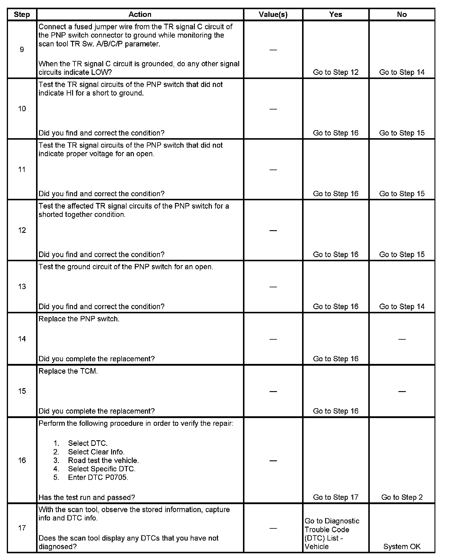 When the TCM detects an invalid combination of TR switch signals, then DTC P0705 sets. DTC P0705 is a type C DTC.