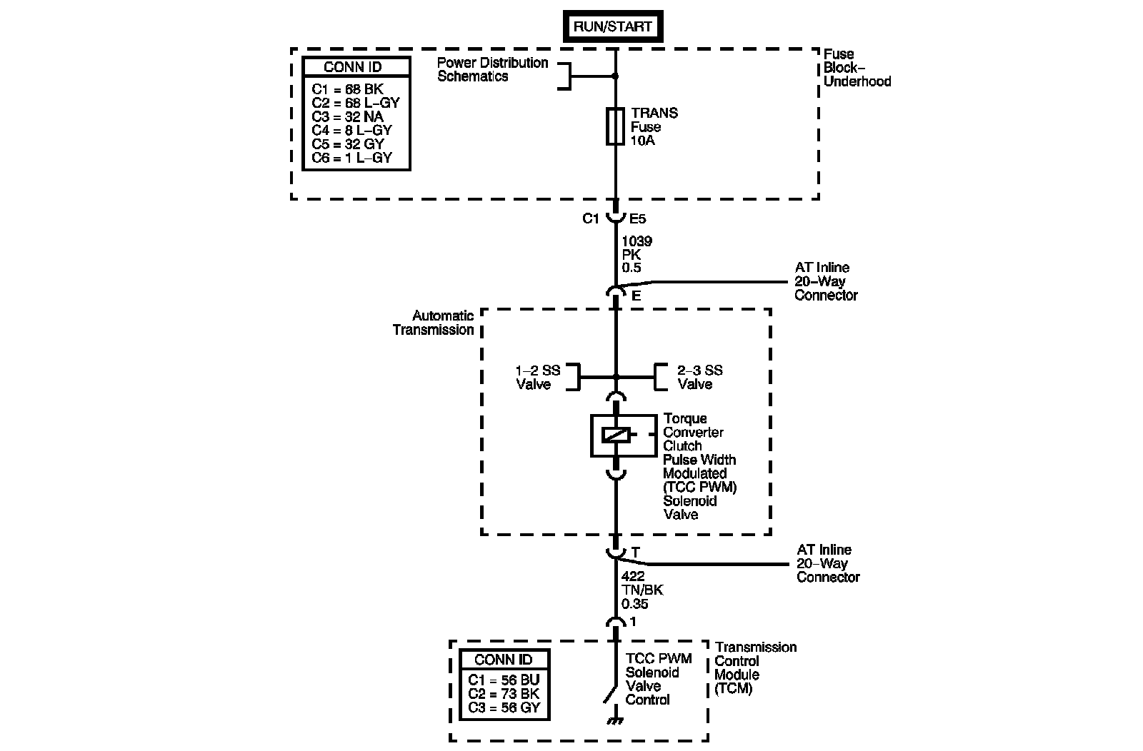 The torque converter clutch pulse width modulated (TCC PWM) solenoid valve is a normally closed solenoid used to control the apply and release of the converter clutch. The transmission control module (TCM) operates the solenoid with a negative duty cycle. When vehicle operating conditions are appropriate to apply the TCC, the TCM immediately increases the duty cycle to approximately 42 percent. The TCM then ramps the duty cycle to approximately 90 percent to achieve full TCC apply pressure. When the solenoid is commanded OFF, the TCM senses high voltage. When the solenoid is commanded ON, the TCM senses low voltage.