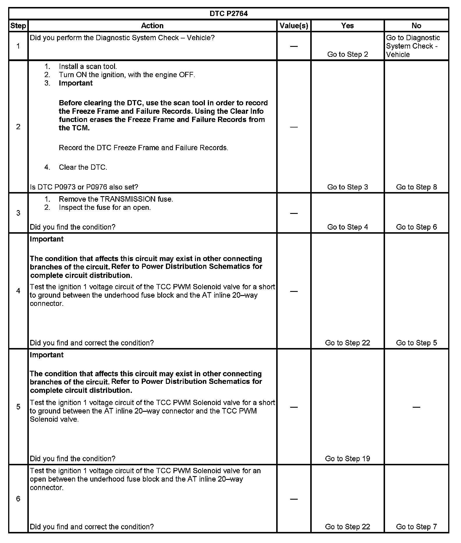 ^ The TCM records the operating conditions when the Conditions for Setting the DTC are met. The TCM stores this information as Freeze Frame and Failure Records.