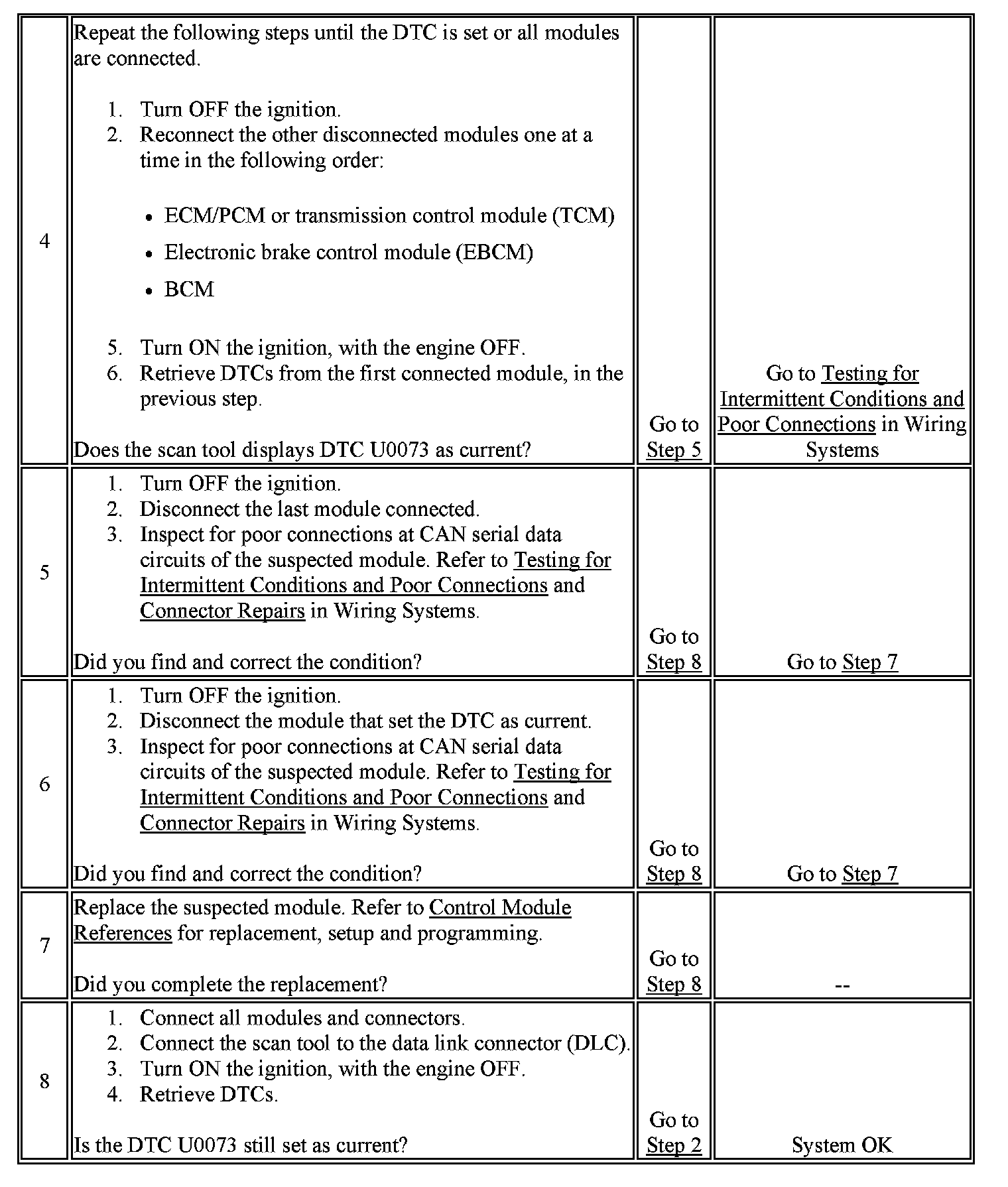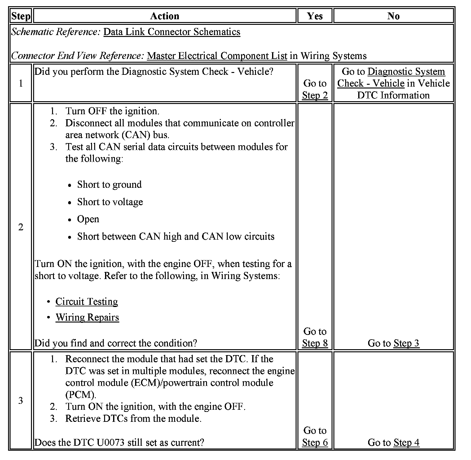 Modules connected to the controller area network (CAN) serial data circuits monitor for serial data communications during normal vehicle operation. Operating information and commands are exchanged among the modules. If no communication is detected on CAN serial data circuit, the DTC is set. A total non communication condition may be caused by a short to battery or voltage on any of the CAN circuits or a short between the CAN high and low circuits.
