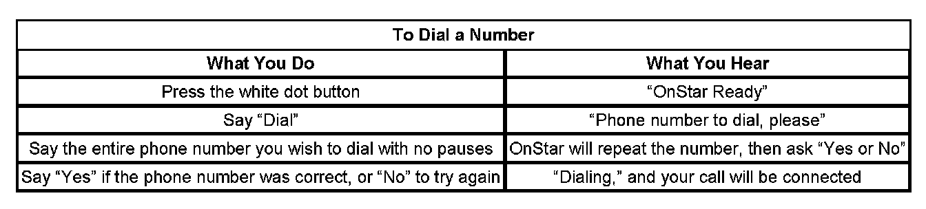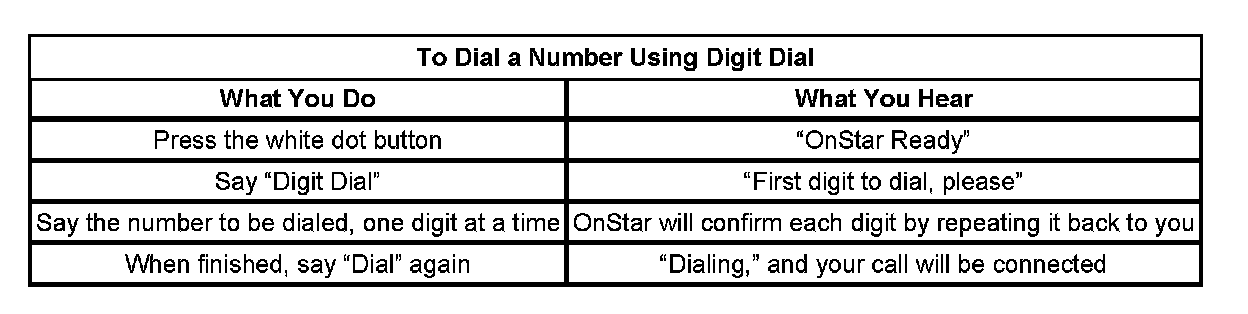 After 3 unsuccessful tries, or if you simply like it better, you can use the "Digit Dial" command to input digits one at a time. Digit Dial is set up to dial phone numbers like previous OnStar Personal Calling Systems.
