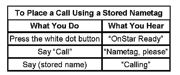 Customers have the ability to store telephone numbers within the module, referenced by a nametag for the convenience of frequently dialed numbers. This process is initiated by pressing the answer/end call button, waiting for the system response, then speaking the response "store". The system will respond with "number please" at which time the user should enter the number desired to be stored. Once complete, saying the word "store" again lets the system know you are finished entering the number. At this time, the system will elicit the user to assign a nametag to that number. From this point forward, the user can dial this number by initiating the OnStar(R) personal calling (OPC) feature, speaking the word "call," and repeating the nametag assigned. To delete a nametag, the user should initiate OPC, say "delete" then speak the nametag to be removed. In the event a nametag cannot be deleted in spite of repeated attempts from several speakers, the OnStar(R) module will require replacement.