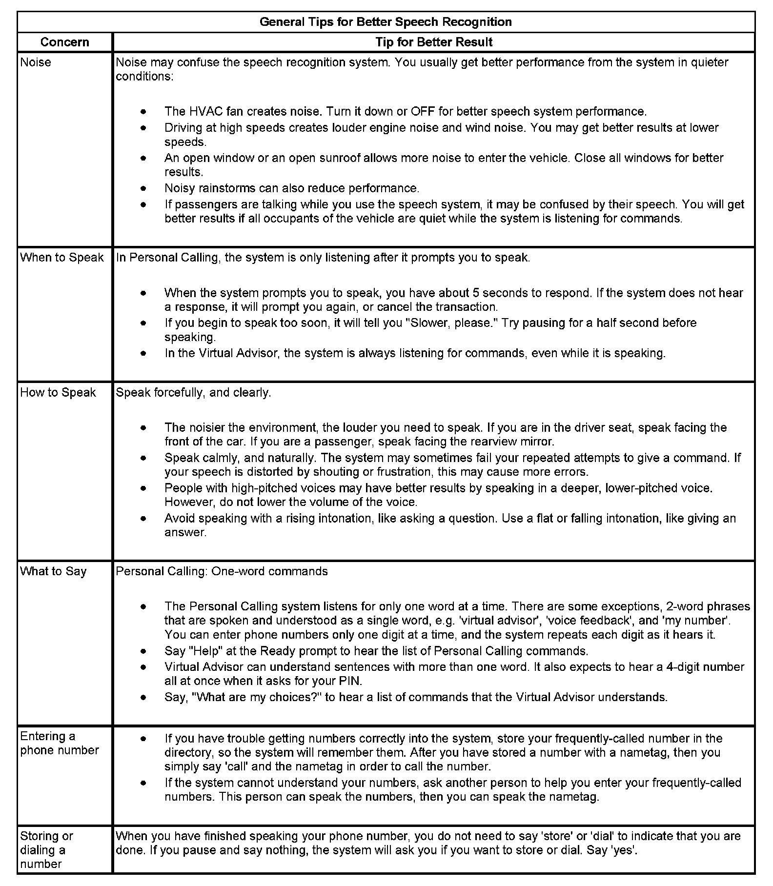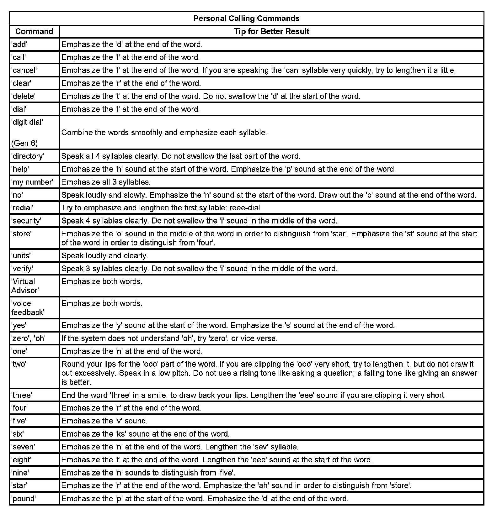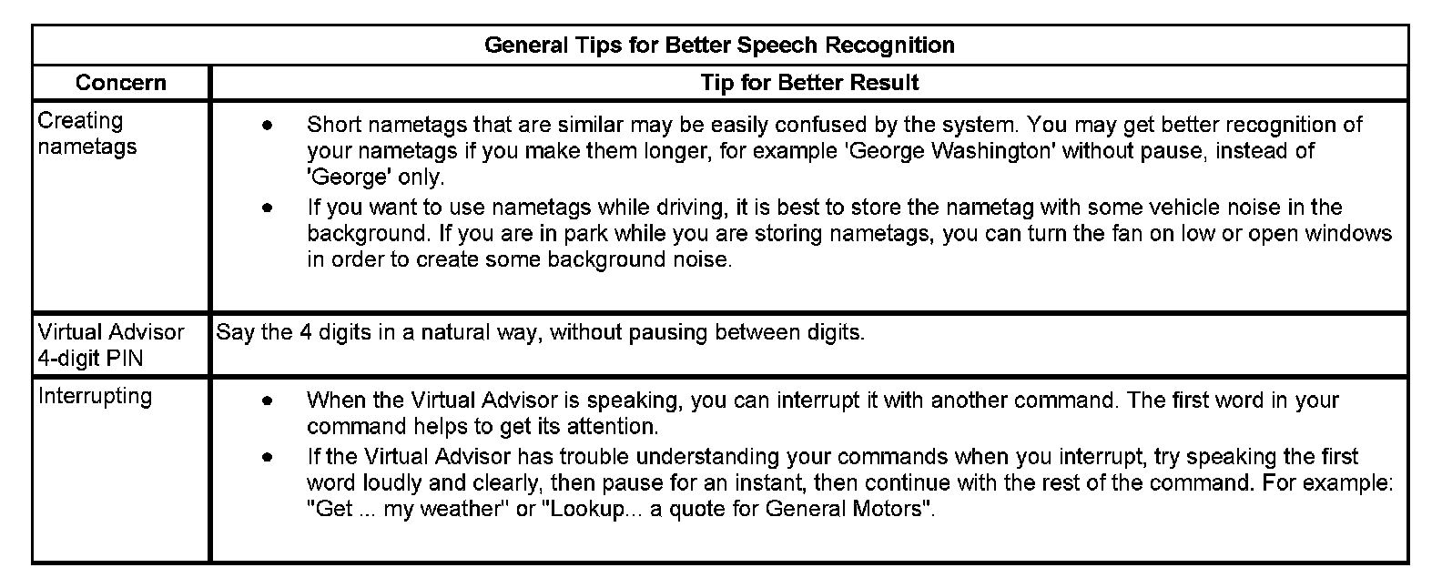 The OnStar(R) speech recognition systems use speech technology that is designed to understand a wide range of American English speakers. Although there is no one right way to speak English, the system will work best when users try to modify their pronunciation should they encounter difficulty. Users who do not obtain good results are advised to try the tips and workarounds found.