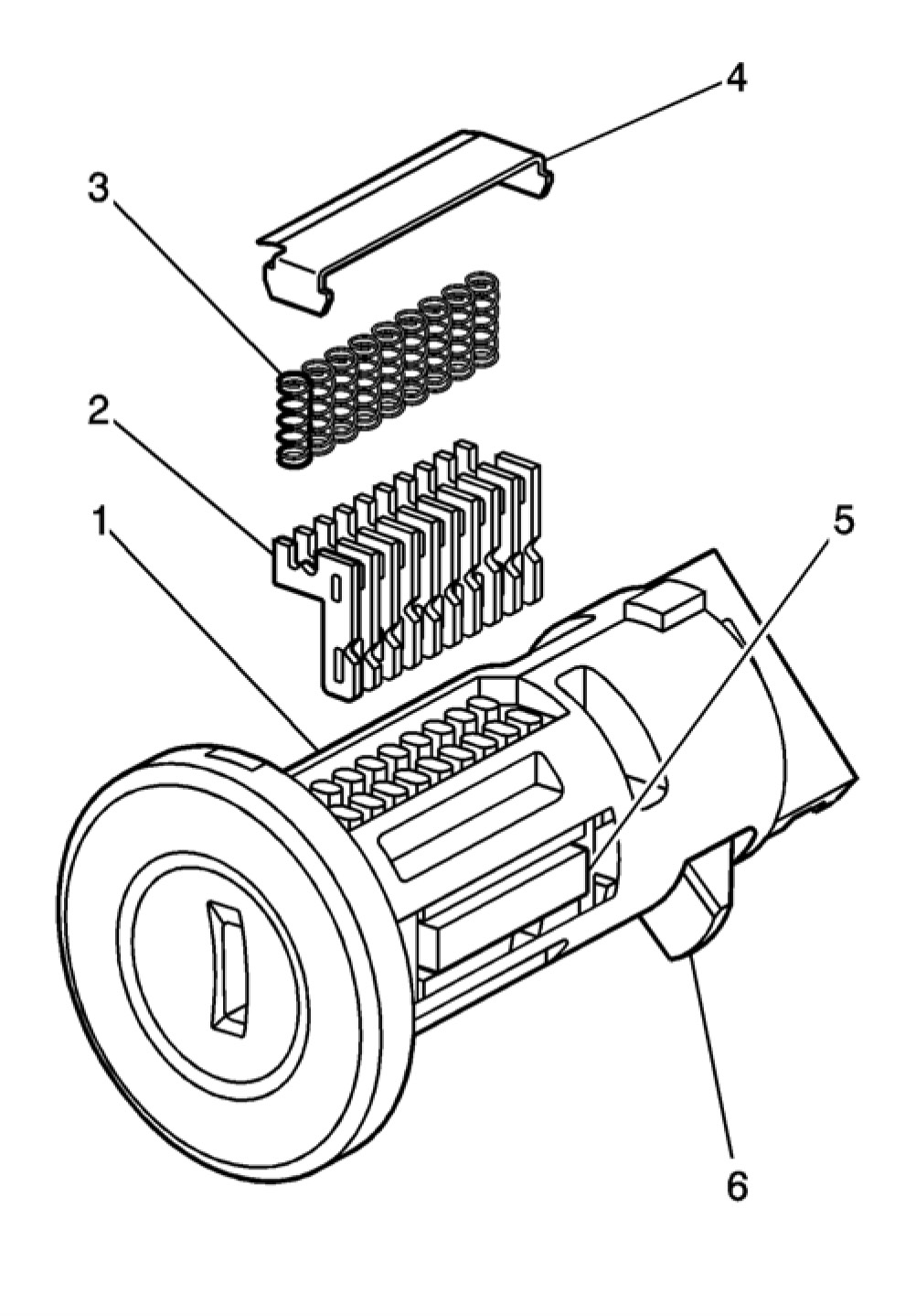 Note: The rear compartment lid lock cylinder tumblers (3) are not self-retaining and must be held in place if the key is not fully inserted into the lock cylinder or until the cylinder (1) is assembled into the case (4).
