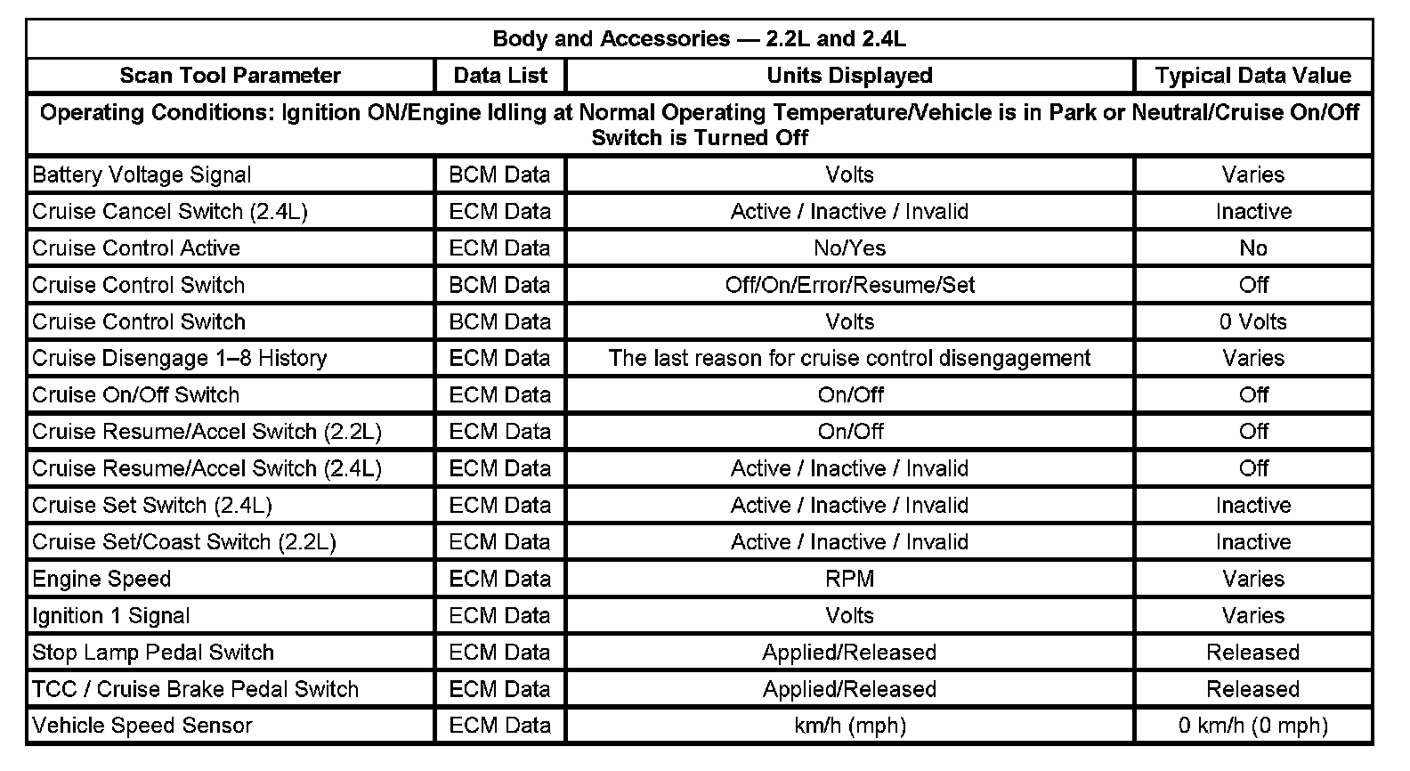 The typical data values are obtained from a properly operating vehicle under the conditions specified in the first row of the scan tool data list table. Comparison of the parameter values from the suspect vehicle with the typical data values may reveal the source of the customer concern.