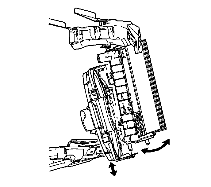 8. Align the cooling fan shroud retaining features to the radiator. Pull down on the cooling fan assembly to snap the shroud onto the radiator.