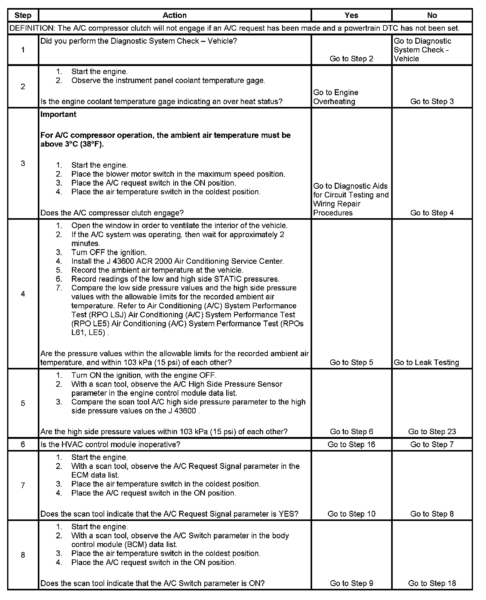2. The A/C compressor relay output is disabled if engine coolant temperature is above 123°C (253°F). The instrument panel engine coolant gage will indicate overheating.