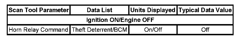 The Horns Scan Tool Data List contains all of the horn related parameters that are available on the scan tool. The parameters in the list are arranged in alphabetical order. The column, "Data List," indicates the location of the parameter within the scan tool menu selections. Use the Horns Scan Tool Data List as directed by a diagnostic table or in order to supplement the diagnostic procedures. Begin all of the diagnostic procedures with Diagnostic System Check - Vehicle. Testing and Inspection