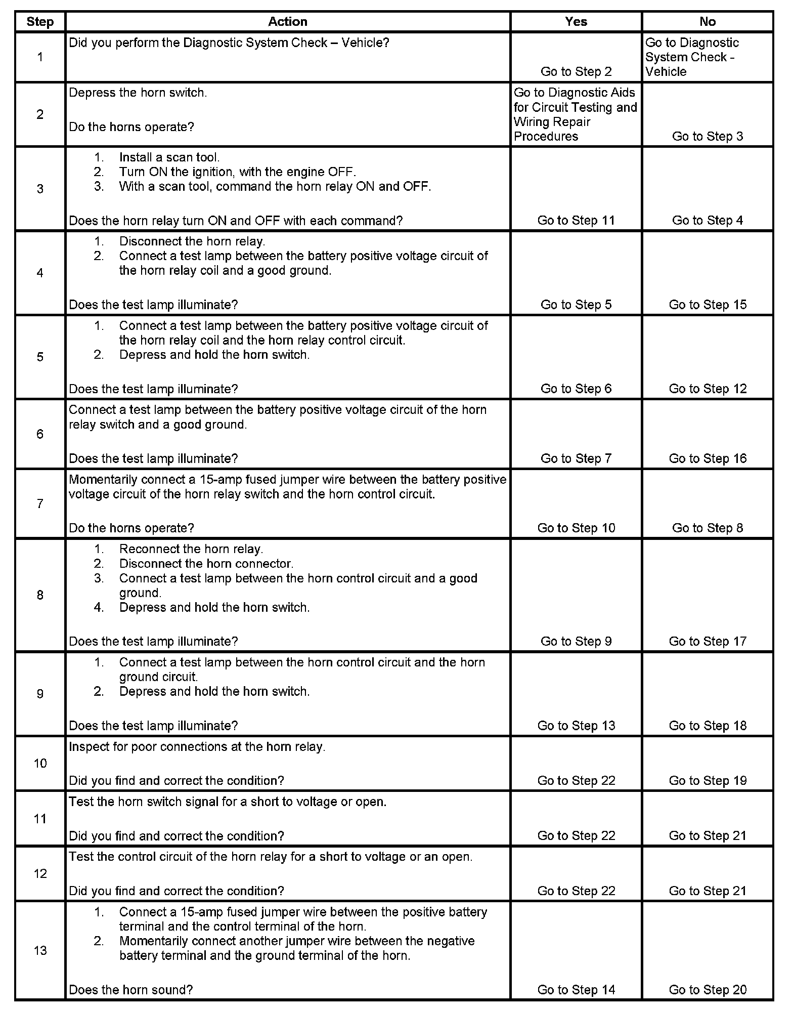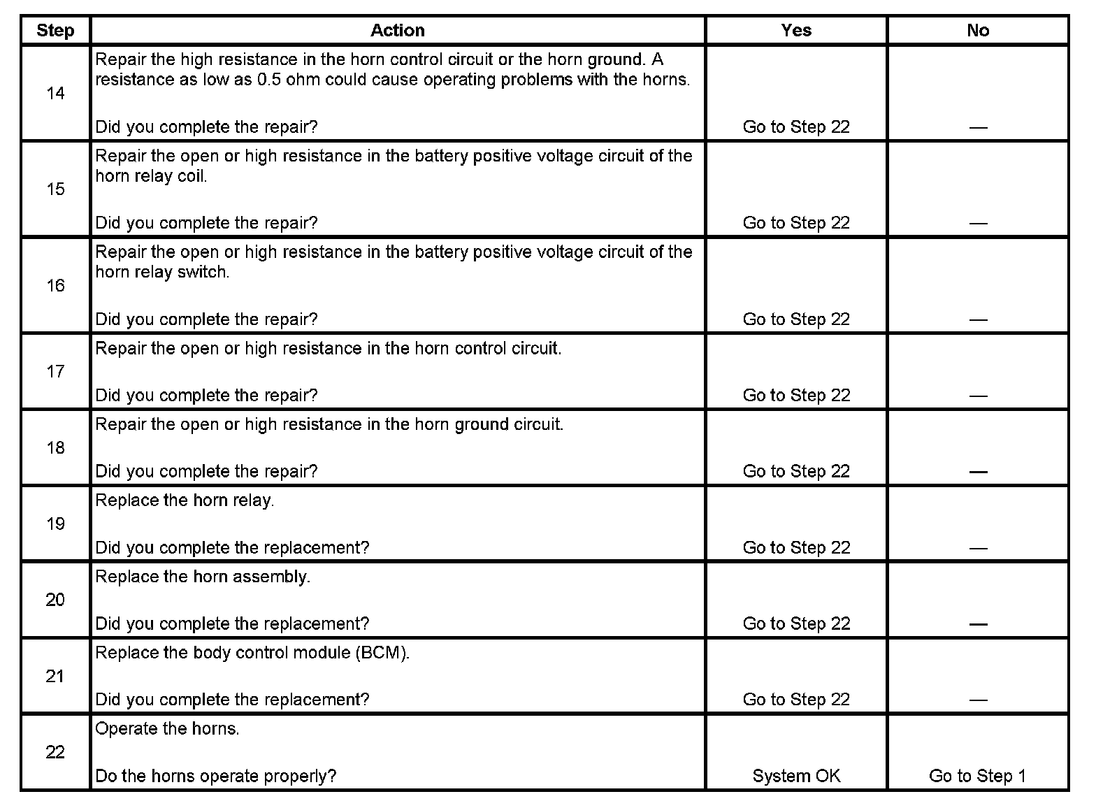 14. The horns need maximum current flow to operate properly. A high resistance, greater than 0.5 ohm, in the horn control circuit or the horn ground circuit could cause operating problems with the horns. Inspect the circuits for faults that would restrict current flow.