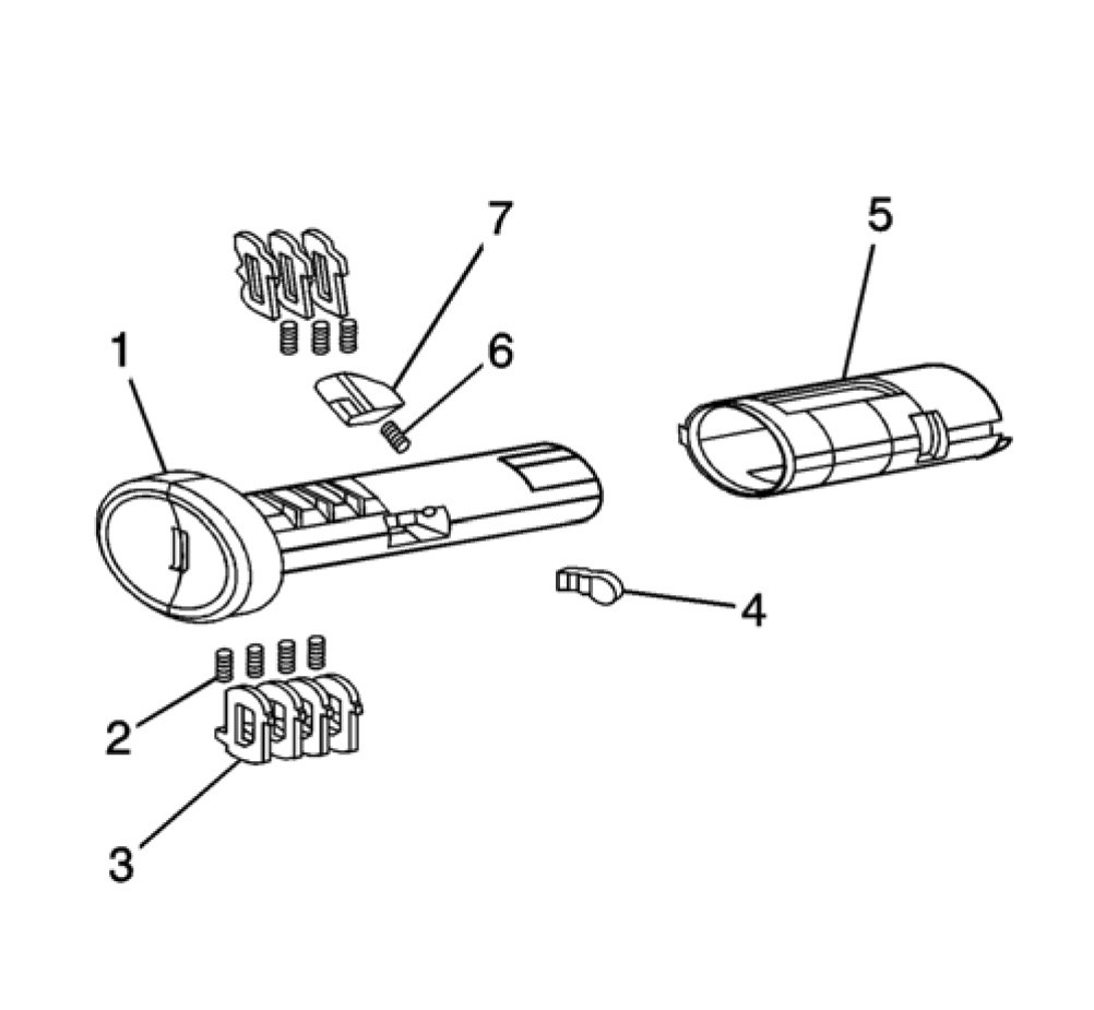 The ignition lock cylinder uses only 9 of the 10 cut positions, 2-10. The ignition cylinder tumblers (2) are all located on one side of the cylinder (1) and not self-retaining. A retainer (4) secures the tumblers. It follows the key code with the first tumbler being the first depth of the key code.