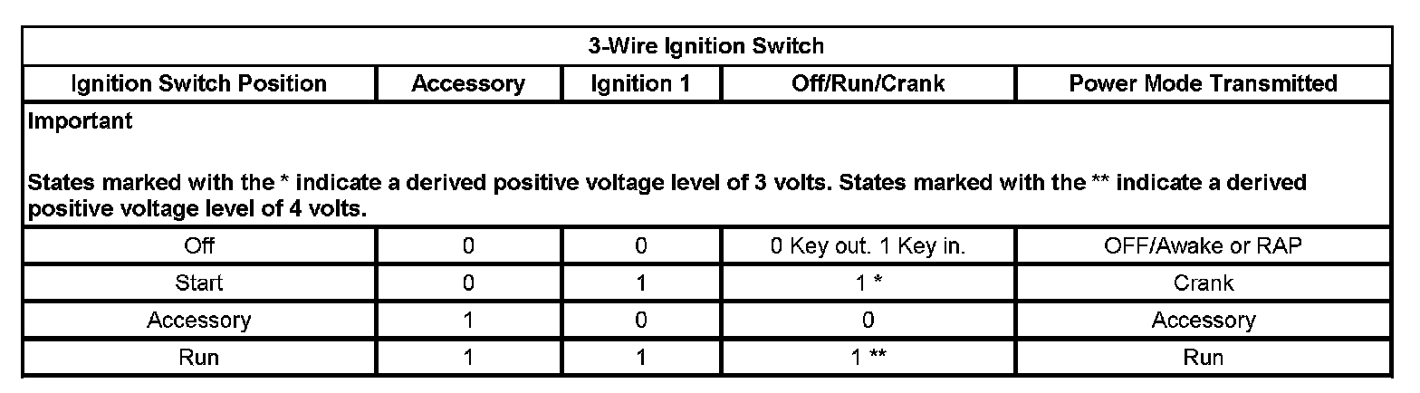 On vehicles that have several control modules connected by serial data circuits, one module is the power mode master (PMM). On this vehicle, the PMM is the body control module (BCM). The PMM receives 3 discrete ignition switch signals to differentiate which power mode will be sent over the Serial Data circuits. The 3-wire Ignition Switch table illustrates the state of these inputs in correspondence to the ignition switch position.