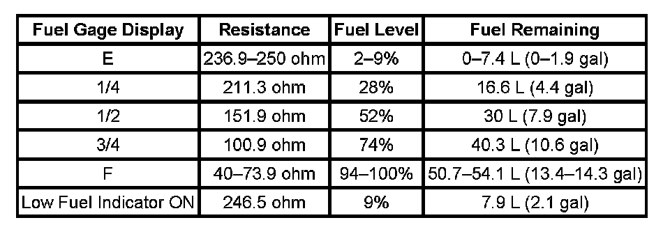 The information in this table is intended for use with the J 33431-C Signal Generator and Instrument Panel Tester. The fuel level sensor values represent the test values to be used on the Signal Generator to drive the fuel gage display to the indicated positions. Vehicles that require more than one fuel level sensor calculate gage position from many possible resistance combinations of fuel levels between the two tanks. Therefore, the values in the table may not correlate directly to readings taken from the vehicle primary or secondary sending units.