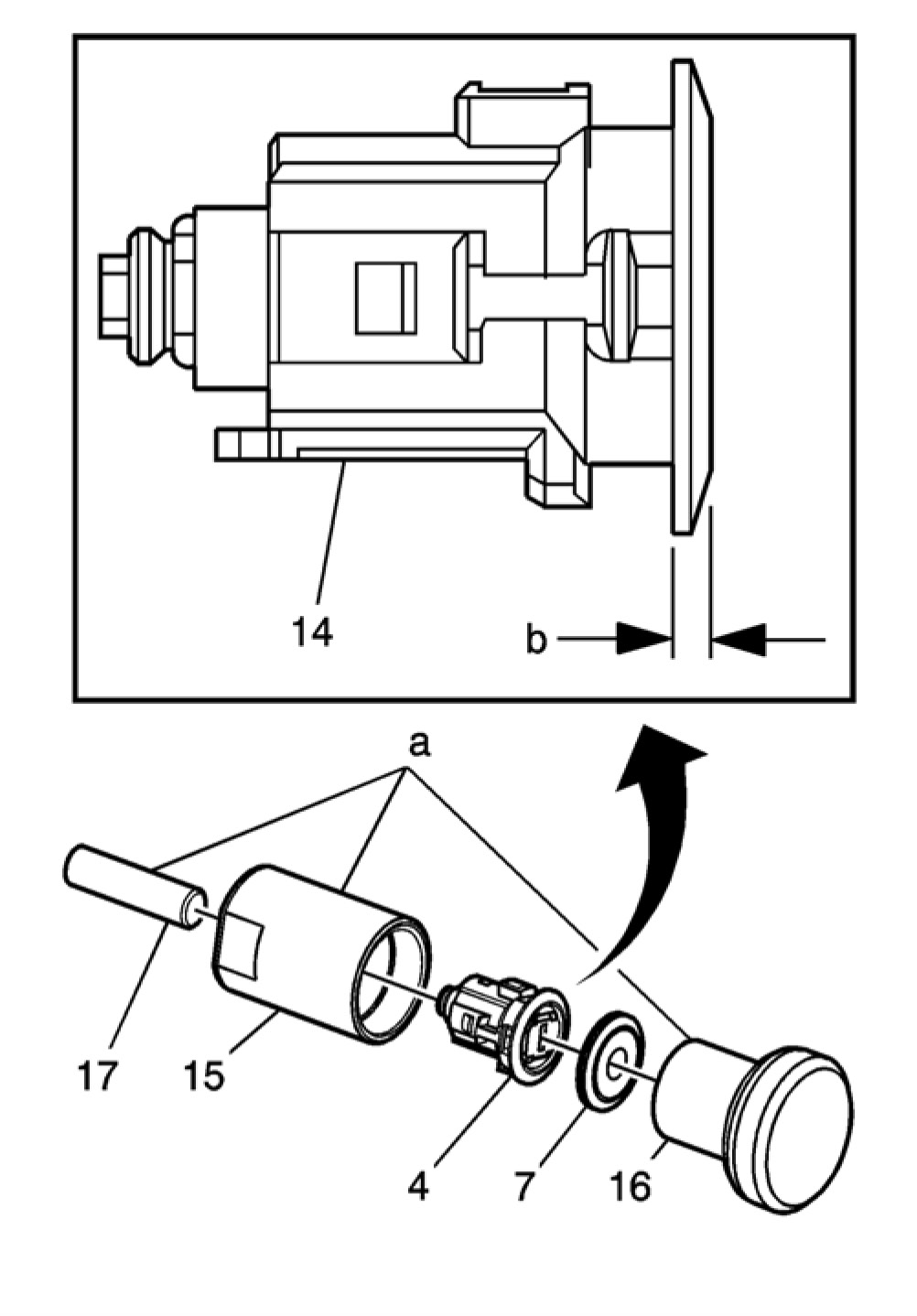 16. Stake the cap (7) onto the head of the case (4) by using the appropriate staking tool BO-48370 . Ensure proper orientation and set the cylinder assembly (14), (which includes the case (4), coded cylinder (1), shutter springs (5), and shutter assembly (6)) and the cap (7) into the staking cup (15) and clamp into vise. Remove any debris and install the cleaned staking ram (16) into staking cup (15) and with a dead blow hammer, hit the staking ram (16) with moderate force 2 or 3 times. Check to determine if cap is securely staked to the cylinder assembly (14). Repeat previous step until cap is securely staked to the cylinder assembly. Remove assembly from the staking cup (15). If necessary, insert the removal punch (17) into the opposite end of the staking cup and tap lightly. Confirm that the shutter springs (5) push the shutter assembly (6) up against the inside surface of the cap (7).