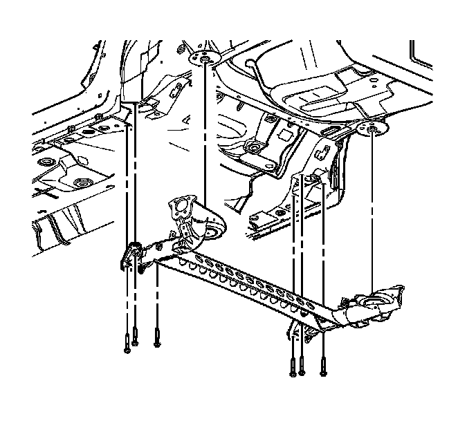 Rear axle to vehicle alignment is achieved through alignment holes located in both the left and right axle bracket and underbody. Whenever the rear axle is removed for service, it is important that the rear axle is re-installed in its proper position relative to the centerline of the vehicle. Use two 12 mm rods to achieve this alignment. Insert each rod through the axle bracket into the underbody, then tighten the bracket bolts.