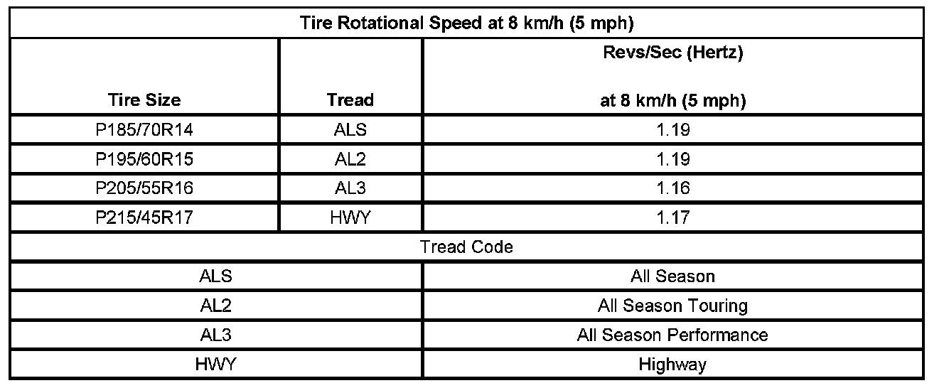 1. Determine the rotational speed of the tires in revolutions per second (RPS), or Hertz (Hz), at 8 km/h (5 mph), based on the size of the tires. Refer to the Tire Rotational Speed table.