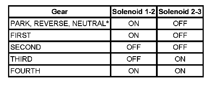 Important: The solenoid states are normally ON (1-2) and OFF (2-3) in the P, R, and N gears. However, these may change based on the vehicle speed and the throttle position.