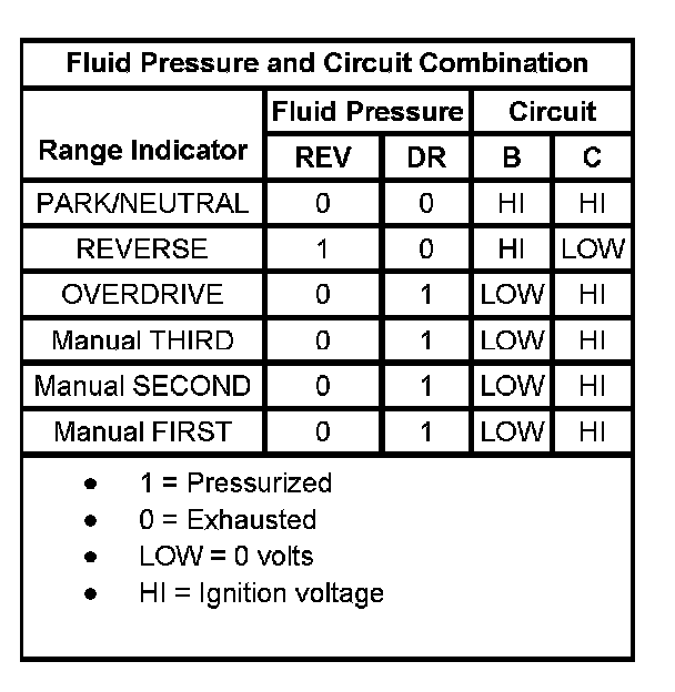 Each fluid pressure switch produces either an open or a ground to the TCM depending on the presence of fluid pressure at the switches. The sequence of open and closed switches produces a combination of voltage readings. The TCM monitors these readings.