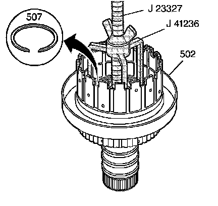 4. Compress the coast clutch return spring retainer (506). Use the J 41236 and J 23327 or equivalent.