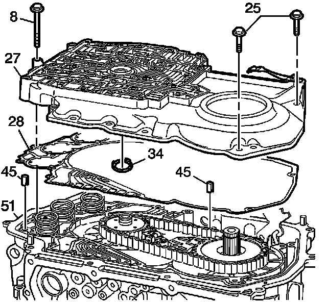 3. Install a new channel plate to case gasket (28) onto the transmission case (51).