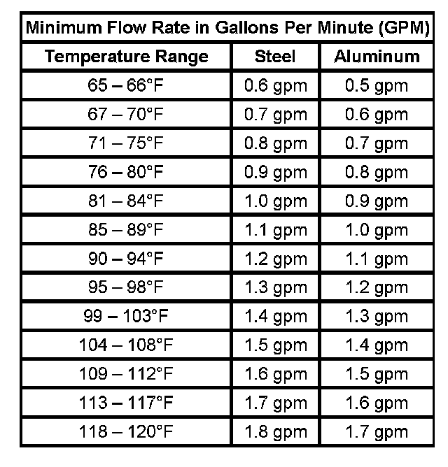 3. Refer to the table below. Using the temperature from step 1, locate on either the Steel MINIMUM Flow Rate table or the Aluminum MINIMUM Flow Rate table the minimum flow rate in gallons per minutes (GPM). Record the minimum flow rate in GPMs and the supply fluid temperature for further reference.