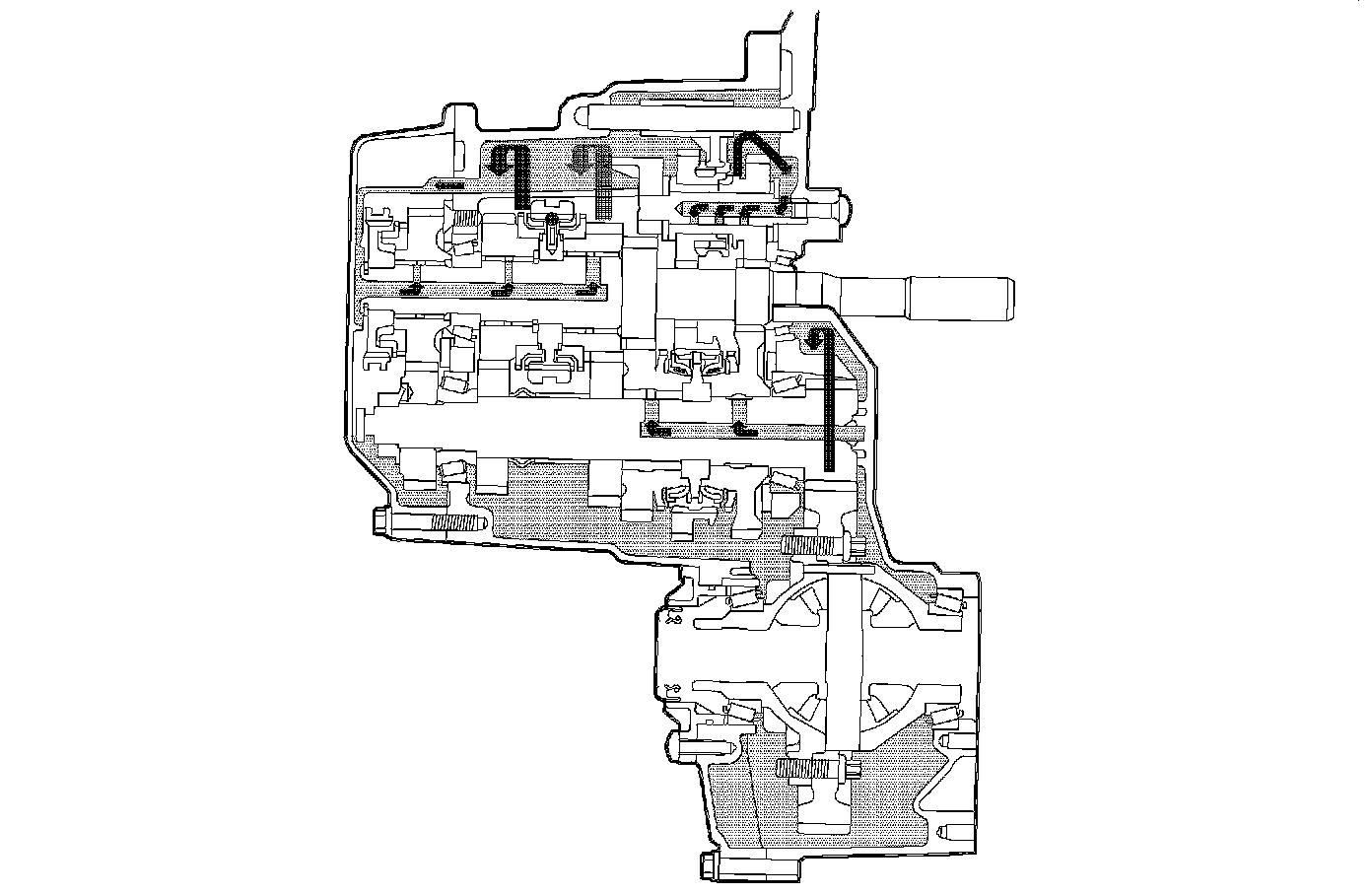 All fundamental components, including the transaxle case, clutch housing, input shaft, output shaft, and differential assembly are supported by tapered roller bearings. Pre-loading of the bearings is required.