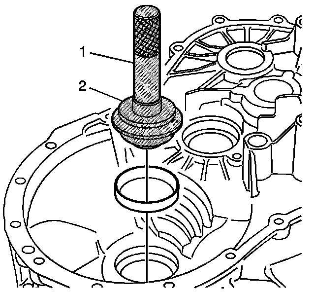 6. Install a new differential bearing race to the transmission housing using the J 44385 (2) and the J 7079-2 (1).