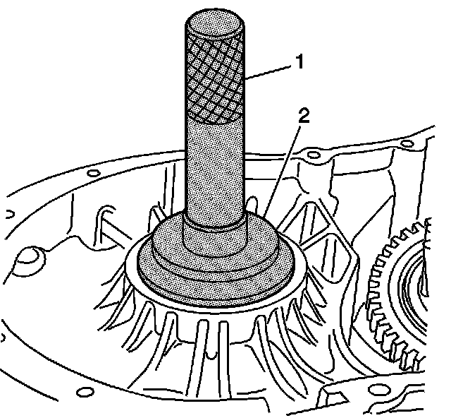 9. Make sure the left differential bearing race is fully seated into the transaxle case using the J 7079-2 (1) and the J 44385 (2).