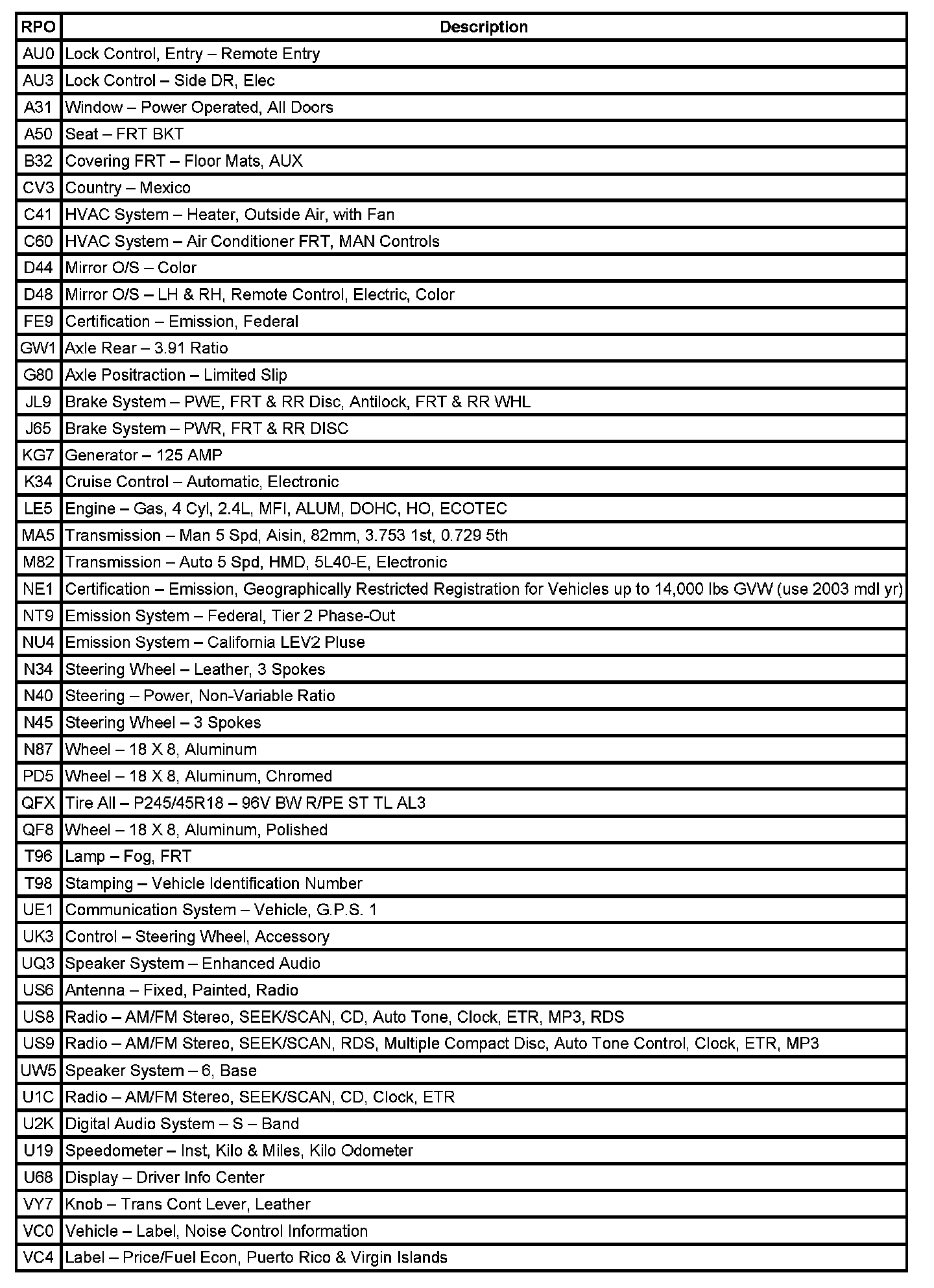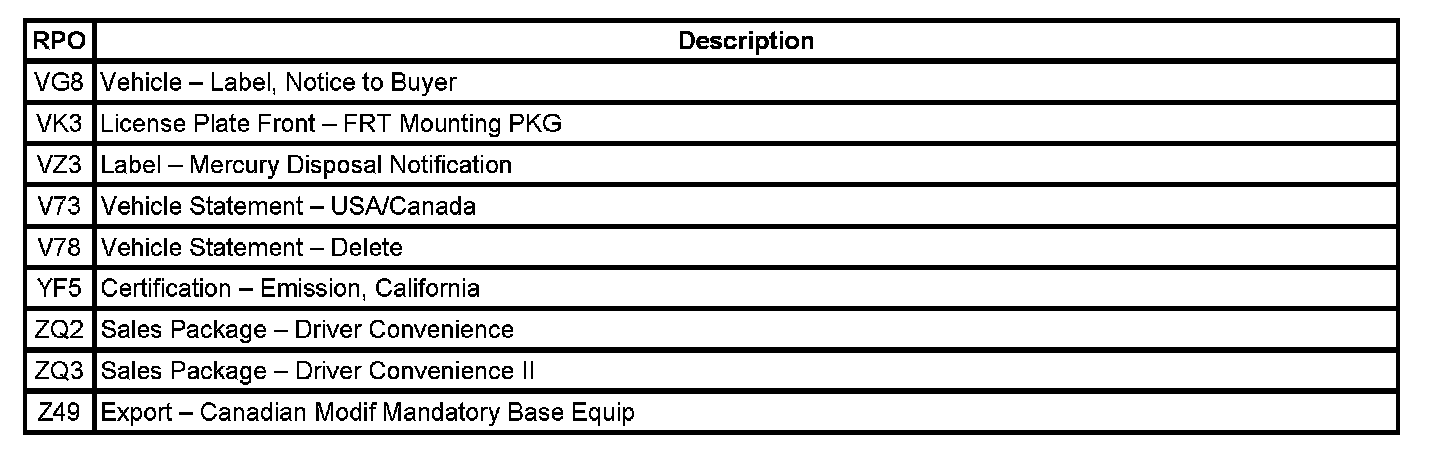 The table provides the description of the Regular Production Option (RPO) codes that are available on the vehicle. The vehicle RPO list is printed on the Service Parts Identification Label.