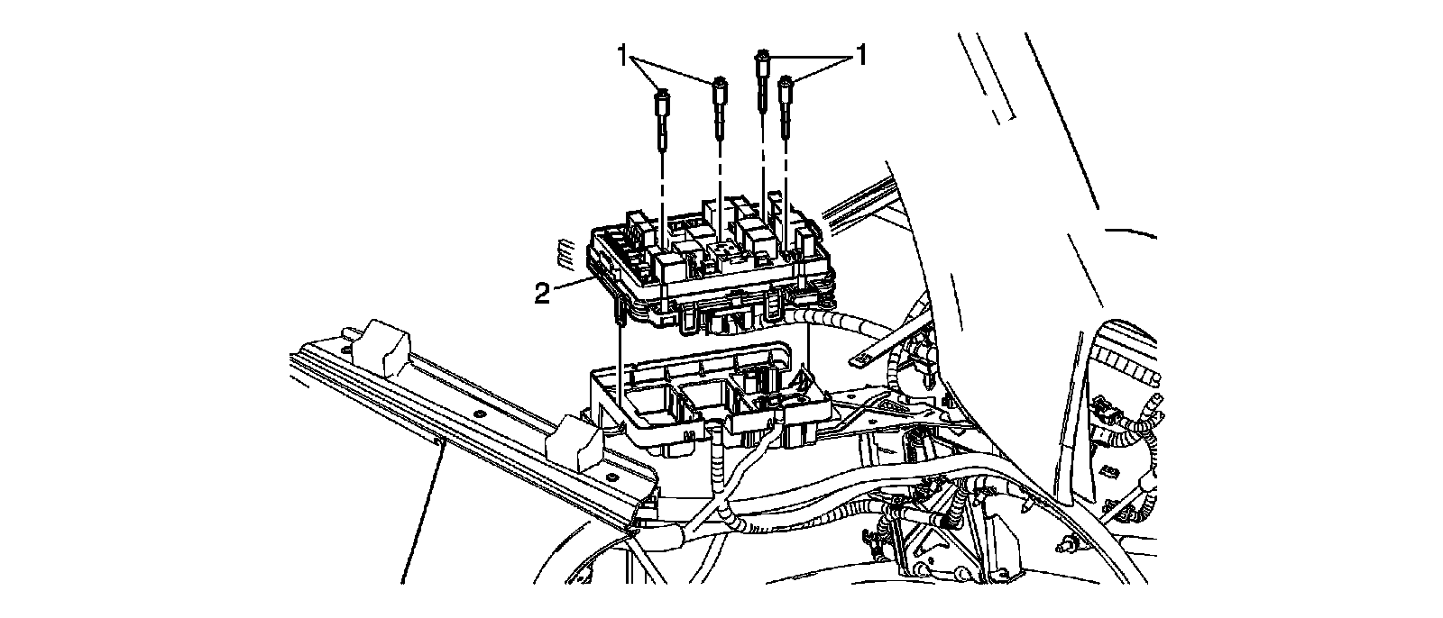 6. Remove the fasteners (1) and (2) that secure the electrical center to vehicle.
