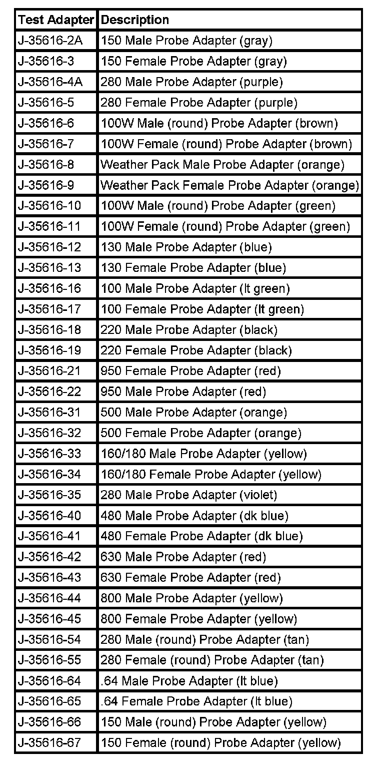 NOTE: Do not insert test equipment probes (DVOM etc.) into any connector or fuse block terminal. The diameter of the test probes will deform most terminals. A deformed terminal will cause a poor connection, which will result in a system failure. Always use the J-35616 GM-Approved Terminal Test Kit or the J 42675 Flat-Wire Probe Adapter in order to front probe terminals. Do not use paper clips or other substitutes to probe terminals.