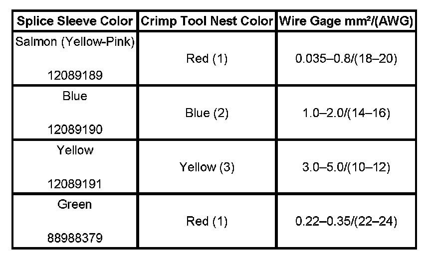 4. Select the proper DuraSeal splice sleeve according to the wire size. Refer to the above table at the beginning of the repair procedure for the color coding of the DuraSeal splice sleeves and the crimp tool nests.