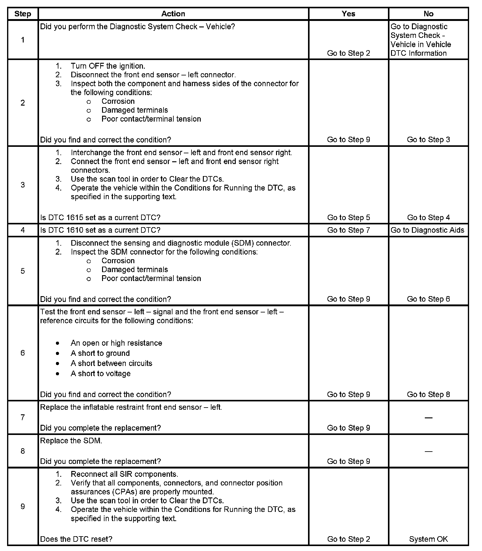 The inflatable restraint front end sensor is a crash sensing device used in the detection of a frontal collision. The front end sensor is used by the inflatable restraint sensing and diagnostic module (SDM) to help determine whether or not certain frontal crashes are severe enough to warrant deployment of the frontal air bags. The SDM applies voltage to the sensor - reference circuit and monitors the voltage at the sensor - signal circuit in order to verify proper circuit integrity. If the SDM detects a malfunction within the sensor circuit, a DTC will be set.