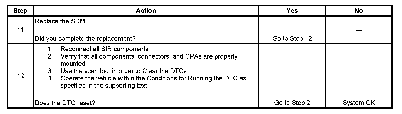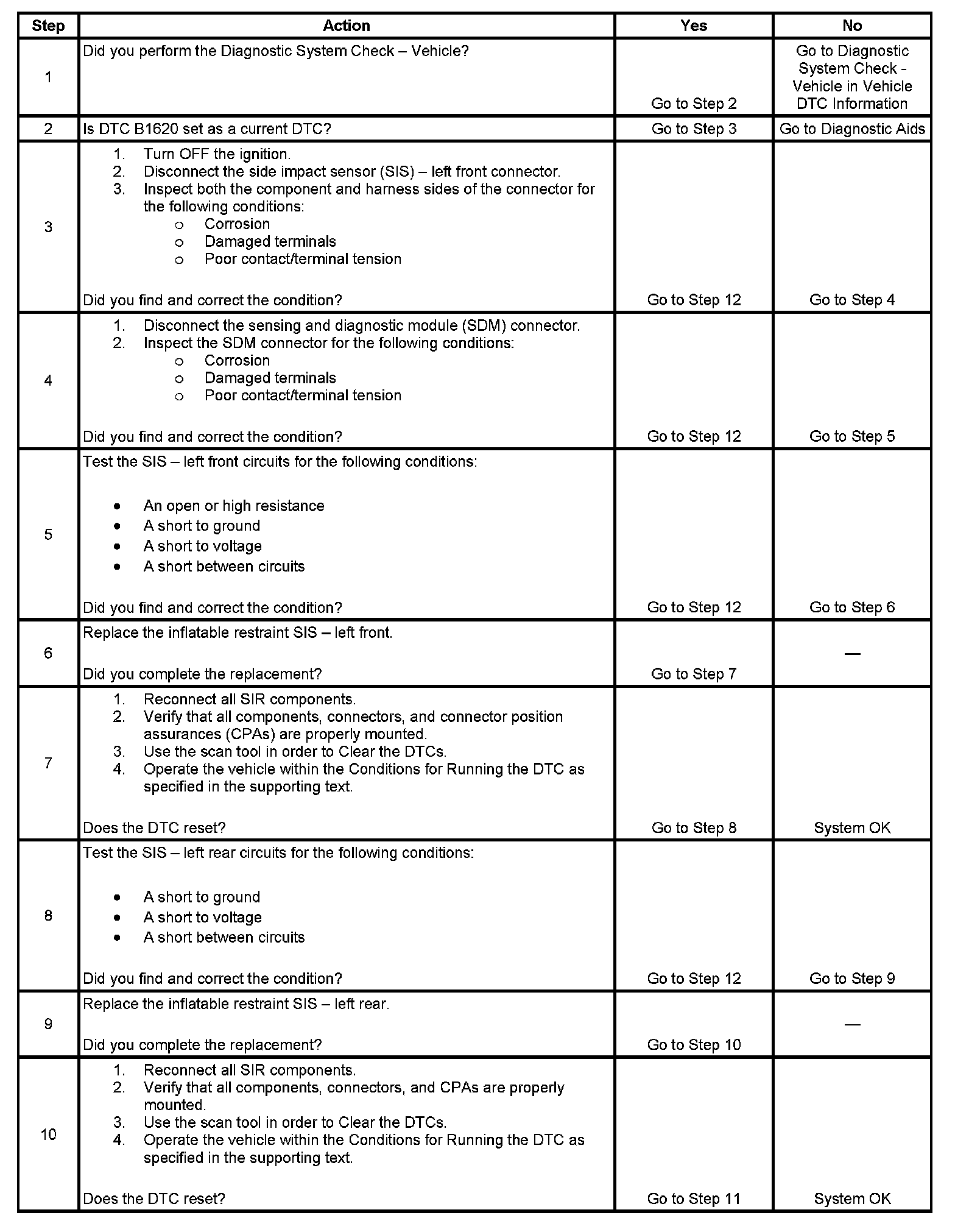 The inflatable restraint side impact sensor (SIS) is a crash sensing device used in the detection of a side impact collision. The SIS is used to monitor vehicle velocity changes to detect side impact crashes that are severe enough to warrant deployment of the inflatable restraint side impact module. The SIS receives power and ground from the inflatable restraint sensing and diagnostic module (SDM). The SIS communicates the status of the side impact air bag system to the SDM via a diagnostic line. If the SDM detects a malfunction within the SIS circuit, a DTC will be set.