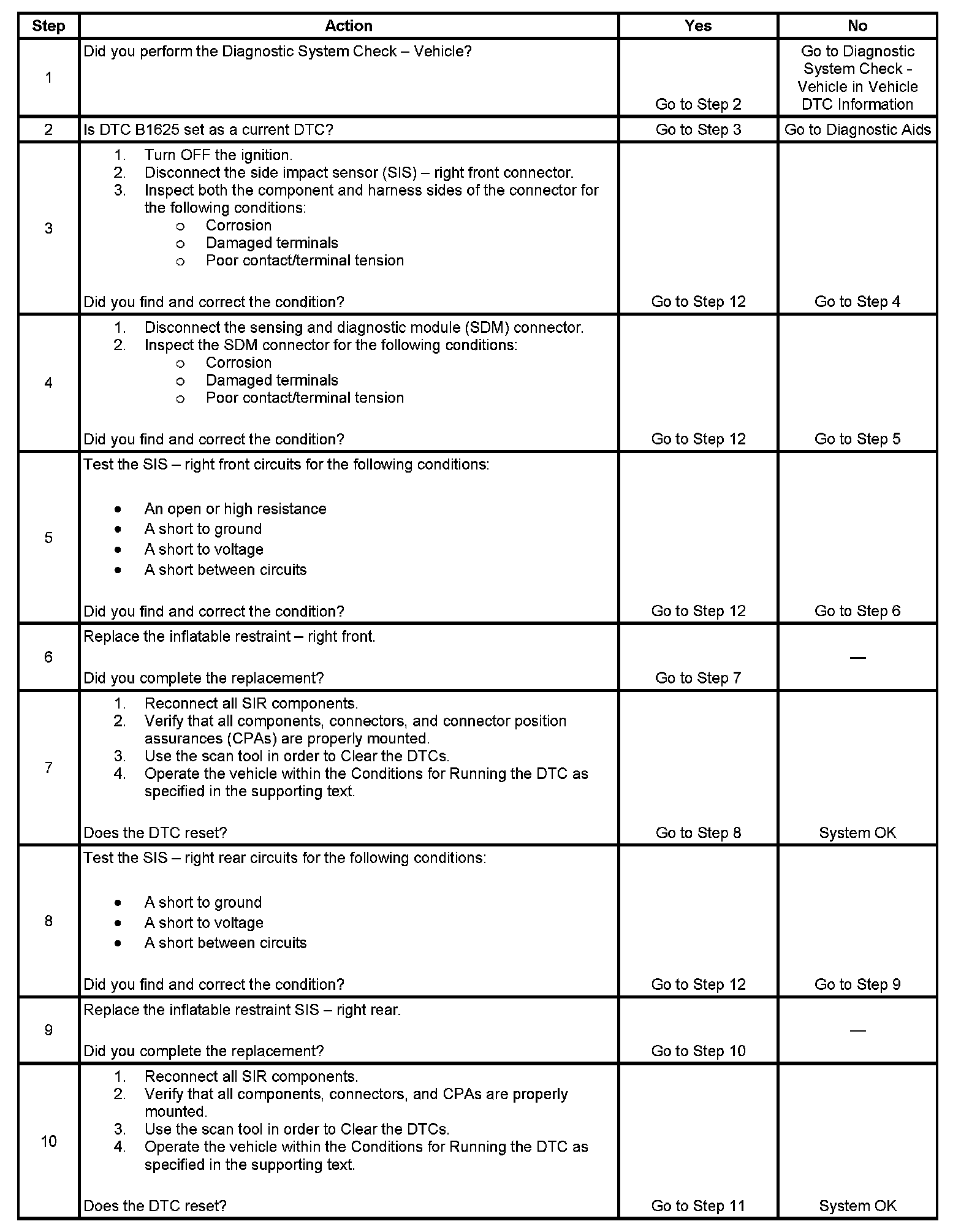 The inflatable restraint side impact sensor (SIS) is a crash sensing device used in the detection of a side impact collision. The SIS is used to monitor vehicle velocity changes to detect side impact crashes that are severe enough to warrant deployment of the inflatable restraint side impact module. The SIS receives power and ground from the inflatable restraint sensing and diagnostic module (SDM). The SIS communicates the status of the side impact air bag system to the SDM via a diagnostic line. If the SDM detects a malfunction within the SIS circuit, a DTC will be set.
