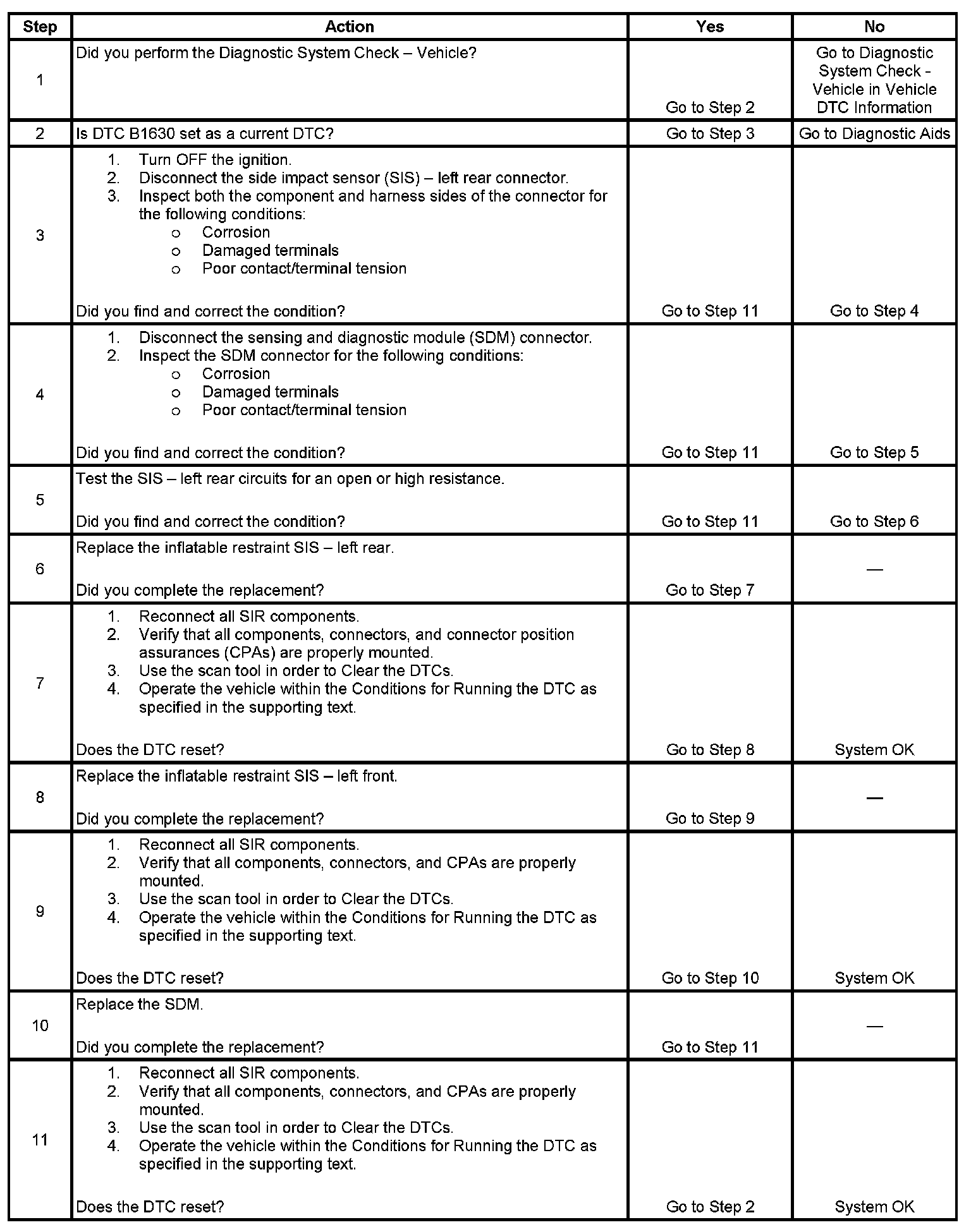 The inflatable restraint side impact sensor (SIS) is a crash sensing device used in the detection of a side impact collision. The SIS is used to monitor vehicle velocity changes to detect side impact crashes that are severe enough to warrant deployment of the inflatable restraint side impact module. The SIS receives power and ground from the inflatable restraint sensing and diagnostic module (SDM). The SIS communicates the status of the side impact air bag system to the SDM via a diagnostic line. If the SDM detects a malfunction within the SIS circuit, a DTC will be set.
