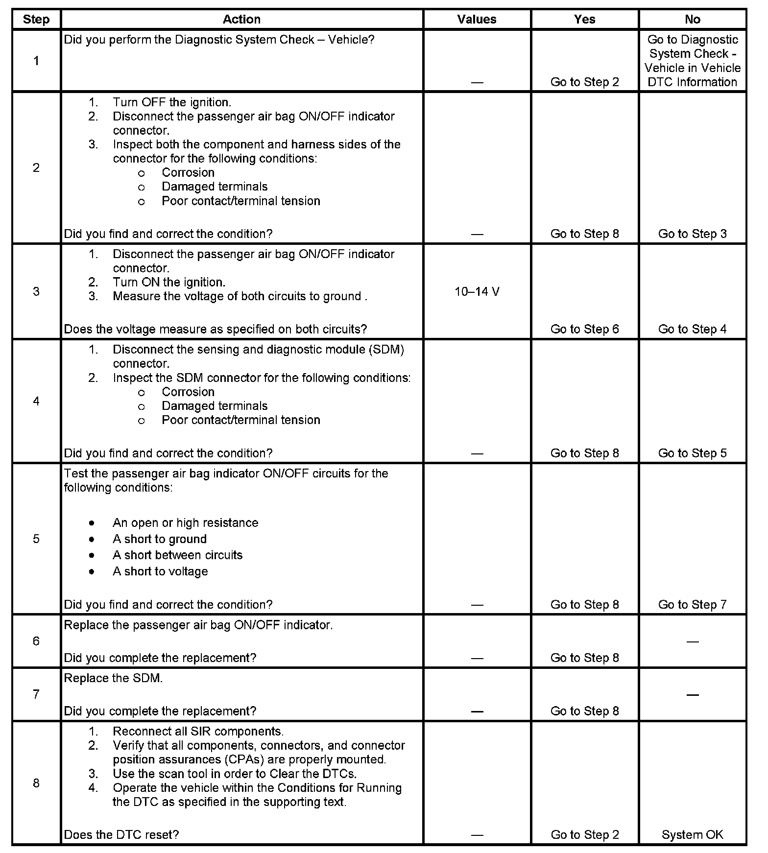 5. Tests for an open, short to ground, or short to voltage in the passenger air bag ON/OFF indicator circuits.