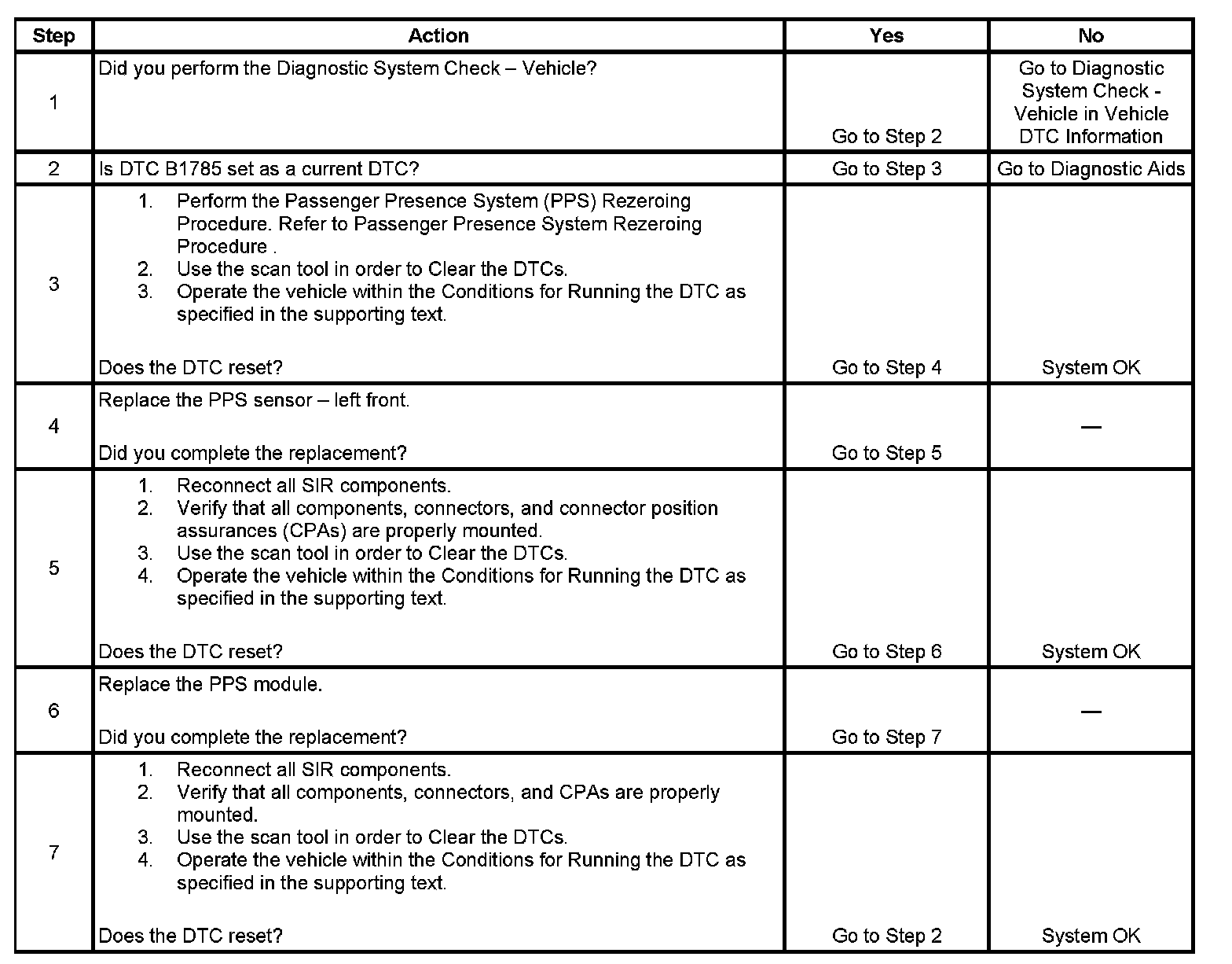 The numbers below refer to the step numbers on the diagnostic table.