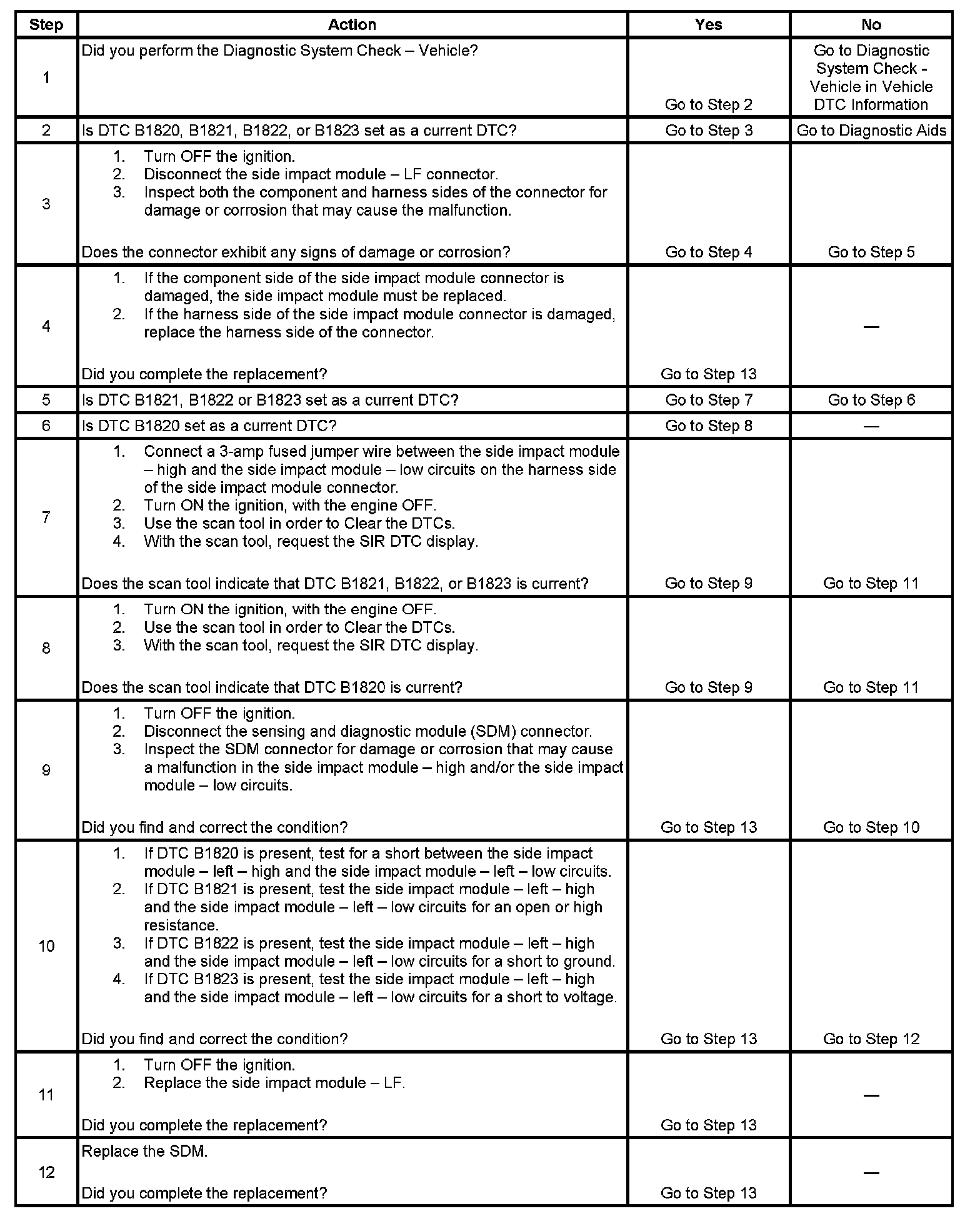 - DTC B1820 will set when the SDM detects a low resistance condition in the side impact module - LF deployment loop.